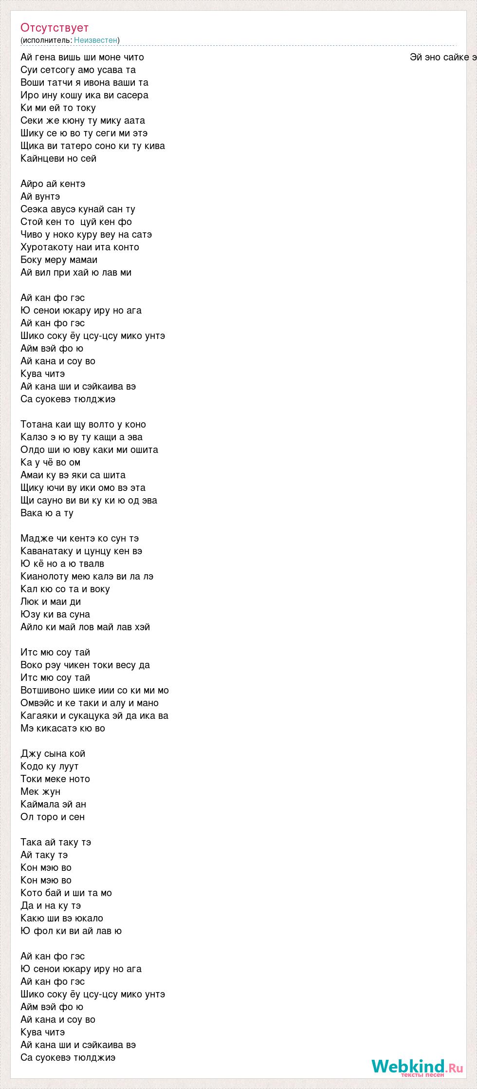 Ай гена вишь ши моне чито Эй эно сайке э Суи сетсогу амо усава та Воши татчи я ивона ваши та Иро ину кошу ика ви сасера Ки ми ей то току Секи же кюну ту мику аата Шику се ю во ту сеги ми этэ Щика ви татеро соно ки ту кива Кайнцеви но сей Айро ай кентэ Ай вунтэ Сеэка авусэ кунай сан ту Стой кен то цуй кен фо Чиво у ноко куру веу на сатэ Хуротакоту наи ита конто Боку меру мамаи Ай вил при хай ю лав ми Ай кан фо гэс Ю сенои юкару иру но ага Ай кан фо гэс Шико соку ёу цсу-цсу мико унтэ Айм вэй фо ю Ай кана и соу во Кува читэ Ай кана ши и сэйкаива вэ Са суокевэ тюлджиэ Тотана каи щу волто у коно Калзо э ю ву ту кащи а эва Олдо ши ю юву каки ми ошита Ка у чё во ом Амаи ку вэ яки са шита Щику ючи ву ики омо вэ эта Щи сауно ви ви ку ки ю од эва Вака ю а ту Мадже чи кентэ ко сун тэ Каванатаку и цунцу кен вэ Ю кё но а ю твалв Кианолоту мею калэ ви ла лэ Кал кю со та и воку Люк и маи ди Юзу ки ва суна Айло ки май лов май лав хэй Итс мю соу тай Воко рэу чикен токи весу да Итс мю соу тай Вотшивоно шике иии со ки ми мо Омвэйс и ке таки и алу и мано Кагаяки и сукацука эй да ика ва Мэ кикасатэ кю во Джу сына кой Кодо ку луут Токи меке ното Мек жун Каймала эй ан Ол торо и сен Така ай таку тэ Ай таку тэ Кон мэю во Кон мэю во Кото бай и ши та мо Да и на ку тэ Какю ши вэ юкало Ю фол ки ви ай лав ю Ай кан фо гэс Ю сенои юкару иру но ага Ай кан фо гэс Шико соку ёу цсу-цсу мико унтэ Айм вэй фо ю Ай кана и соу во Кува читэ Ай кана ши и сэйкаива вэ Са суокевэ тюлджиэ