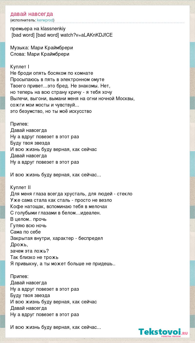 премьера на klassnenkiy [bad word] [bad word] watch?v=aLAKnKDJfCE Музыка: Мари Краймбрери Слова: Мари Краймбрери Куплет I Не броди опять босяком по комнате Просыпаюсь в пять в электронном омуте Твоего привет...это бред. Не знакомы. Нет, но теперь на всю страну кричу - я тебя хочу Вылечи, выгони, вымани меня на огни ночной Москвы, сожги мои мосты и чувствуй... это безумство, но ты моё искусство Припев: Давай навсегда Ну а вдруг повезет в этот раз Буду твоя звезда И всю жизнь буду верная, как сейчас Давай навсегда Ну а вдруг повезет в этот раз И всю жизнь буду верная, как сейчас... Куплет II Для меня глаза всегда хрусталь, для людей - стекло Уже сама стала как сталь - просто не везло Кофе натощак, вспоминаю тебя в мелочах С голубыми глазами в белом…идеален. В целом.. прочь Гуляю всю ночь Сама по себе Закрытая внутри, характер - беспредел Дрожь, зачем эта ложь? Так близко не трожь Я привыкну, а ты может больше не придешь.. Припев: Давай навсегда Ну а вдруг повезет в этот раз Буду твоя звезда И всю жизнь буду верная, как сейчас Давай навсегда Ну а вдруг повезет в этот раз И всю жизнь буду верная, как сейчас...