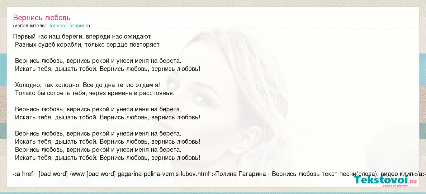 Первый час наш береги, впереди нас ожидают Разных судеб корабли, только сердце повторяет Вернись любовь, вернись рекой и унеси меня на берега. Искать тебя, дышать тобой. Вернись любовь, вернись любовь! Холодно, так холодно. Все до дна тепло отдам я! Только бы согреть тебя, через времена и расстоянья. Вернись любовь, вернись рекой и унеси меня на берега. Искать тебя, дышать тобой. Вернись любовь, вернись любовь! Вернись любовь, вернись рекой и унеси меня на берега. Искать тебя, дышать тобой. Вернись любовь, вернись любовь! Вернись любовь, вернись рекой и унеси меня на берега. Искать тебя, дышать тобой. Вернись любовь, вернись любовь! <a href= [bad word] /www [bad word] gagarina-polina-vernis-lubov.html">Полина Гагарина - Вернись любовь текст песни(слова), видео клип</a>