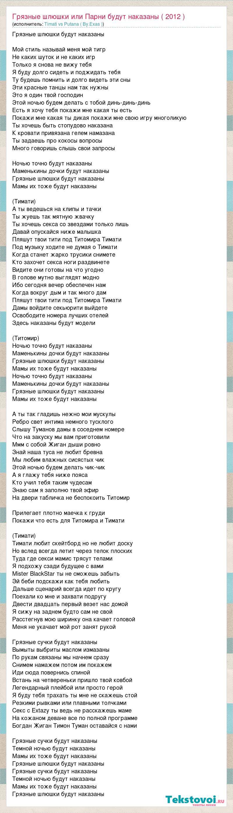 Грязные шлюшки будут наказаны Мой стиль называй меня мой тигр Не каких шуток и не каких игр Только я снова не вижу тебя Я буду долго сидеть и поджидать тебя Ту будешь помнить и долго видеть эти сны Эти красные танцы нам так нужны Это я один твой господин Этой ночью будем делать с тобой динь-динь-динь Есть я хочу тебя покажи мне какая ты есть Покажи мне какая ты дикая покажи мне свою игру многоликую Ты хочешь быть стопудово наказана К кровати привязана гелем намазана Ты задаешь про кокосы вопросы Много говоришь слышь свои запросы Ночью точно будут наказаны Маменькины дочки будут наказаны Грязные шлюшки будут наказаны Мамы их тоже будут наказаны (Тимати) А ты ведешься на клипы и тачки Ты жуешь так мятную жвачку Ты хочешь секса со звездами только лишь Давай опускайся ниже малышка Пляшут твои тити под Титомира Тимати Под музыку ходите не думая о Тимати Когда станет жарко трусики снимете Кто захочет секса ноги раздвинете Видите они готовы на что угодно В голове мутно выглядят модно Ибо сегодня вечер обеспечен нам Когда вокруг дым и так много дам Пляшут твои тити под Титомира Тимати Дамы войдите секьюрити выйдете Освободите номера лучших отелей Здесь наказаны будут модели (Титомир) Ночью точно будут наказаны Маменькины дочки будут наказаны Грязные шлюшки будут наказаны Мамы их тоже будут наказаны Ночью точно будут наказаны Маменькины дочки будут наказаны Грязные шлюшки будут наказаны Мамы их тоже будут наказаны А ты так гладишь нежно мои мускулы Ребро свет интима немного тусклого Слышу Туманов дамы в соседнем номере Что на закуску мы вам приготовили Ммм с собой Жиган дыши ровно Знай наша туса не любит бревна Мы любим влажных сисястых чик Этой ночью будем делать чик-чик А я глажу тебя ниже пояса Кто учил тебя таким чудесам Знаю сам я заполню твой эфир На двери табличка не беспокоить Титомир Прилегает плотно маечка к груди Покажи что есть для Титомира и Тимати (Тимати) Тимати любит скейтборд но не любит доску Но вслед всегда летит через телок плоских Туда где секси мамис трясут телами Я подхожу сзади будущее с вами Mister BlackStar ты не сможешь забыть Эй беби подскажи как тебя любить Дальше сценарий всегда идет по кругу Поехали ко мне и захвати подругу Двести двадцать первый везет нас домой Я сижу на заднем будто сам не свой Расстегнув мою ширинку она качает головой Меня не укачает мой рот занят рукой Грязные сучки будут наказаны Вымыты выбриты маслом измазаны По рукам связаны мы начнем сразу Снимем намажем потом им покажем Иди сюда повернись спиной Встань на четвереньки пришло твой ковбой Легендарный плейбой или просто герой Я буду тебя трахать ты мне не скажешь стой Резкими рывками или плавными толчками Секс с Extazy ты ведь не расскажешь маме На кожаном деване все по полной программе Богдан Жиган Тимон Туман оставайся с нами Грязные сучки будут наказаны Темной ночью будут наказаны Мамы их тоже будут наказаны Грязные шлюшки будут наказаны Грязные сучки будут наказаны Темной ночью будут наказаны Мамы их тоже будут наказаны Грязные шлюшки будут наказаны