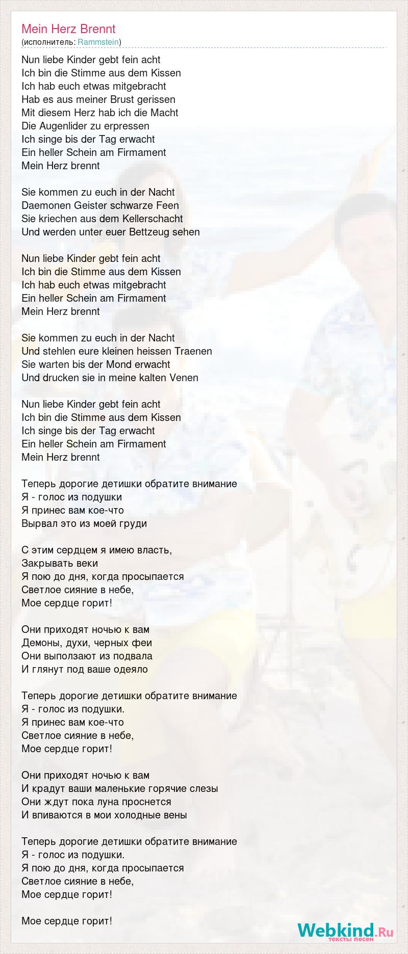 Nun liebe Kinder gebt fein acht Ich bin die Stimme aus dem Kissen Ich hab euch etwas mitgebracht Hab es aus meiner Brust gerissen Mit diesem Herz hab ich die Macht Die Augenlider zu erpressen Ich singe bis der Tag erwacht Ein heller Schein am Firmament Mein Herz brennt Sie kommen zu euch in der Nacht Daemonen Geister schwarze Feen Sie kriechen aus dem Kellerschacht Und werden unter euer Bettzeug sehen Nun liebe Kinder gebt fein acht Ich bin die Stimme aus dem Kissen Ich hab euch etwas mitgebracht Ein heller Schein am Firmament Mein Herz brennt Sie kommen zu euch in der Nacht Und stehlen eure kleinen heissen Traenen Sie warten bis der Mond erwacht Und drucken sie in meine kalten Venen Nun liebe Kinder gebt fein acht Ich bin die Stimme aus dem Kissen Ich singe bis der Tag erwacht Ein heller Schein am Firmament Mein Herz brennt Теперь дорогие детишки обратите внимание Я - голос из подушки Я принес вам кое-что Вырвал это из моей груди С этим сердцем я имею власть, Закрывать веки Я пою до дня, когда просыпается Светлое сияние в небе, Мое сердце горит! Они приходят ночью к вам Демоны, духи, черных феи Они выползают из подвала И глянут под ваше одеяло Теперь дорогие детишки обратите внимание Я - голос из подушки. Я принес вам кое-что Светлое сияние в небе, Мое сердце горит! Они приходят ночью к вам И крадут ваши маленькие горячие слезы Они ждут пока луна проснется И впиваются в мои холодные вены Теперь дорогие детишки обратите внимание Я - голос из подушки. Я пою до дня, когда просыпается Светлое сияние в небе, Мое сердце горит! Мое сердце горит!