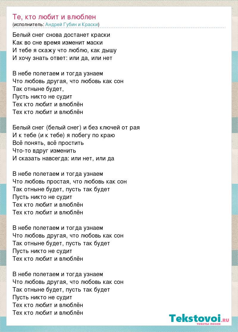 Белый снег снова достанет краски Как во сне время изменит маски И тебе я скажу что люблю, как дышу И хочу знать ответ: или да, или нет В небе полетаем и тогда узнаем Что любовь другая, что любовь как сон Так отныне будет, Пусть никто не судит Тех кто любит и влюблён Тех кто любит и влюблён Белый снег (белый снег) и без ключей от рая И к тебе (и к тебе) я побегу по краю Всё понять, всё простить Что-то вдруг изменить И сказать навсегда: или нет, или да В небе полетаем и тогда узнаем Что любовь простая, что любовь как сон Так отныне будет, пусть так будет Пусть никто не судит Тех кто любит и влюблён Тех кто любит и влюблён В небе полетаем и тогда узнаем Что любовь другая, что любовь как сон Так отныне будет, пусть так будет Пусть никто не судит Тех кто любит и влюблён В небе полетаем и тогда узнаем Что любовь другая, что любовь как сон Так отныне будет, пусть так будет Пусть никто не судит Тех кто любит и влюблён Тех кто любит и влюблён