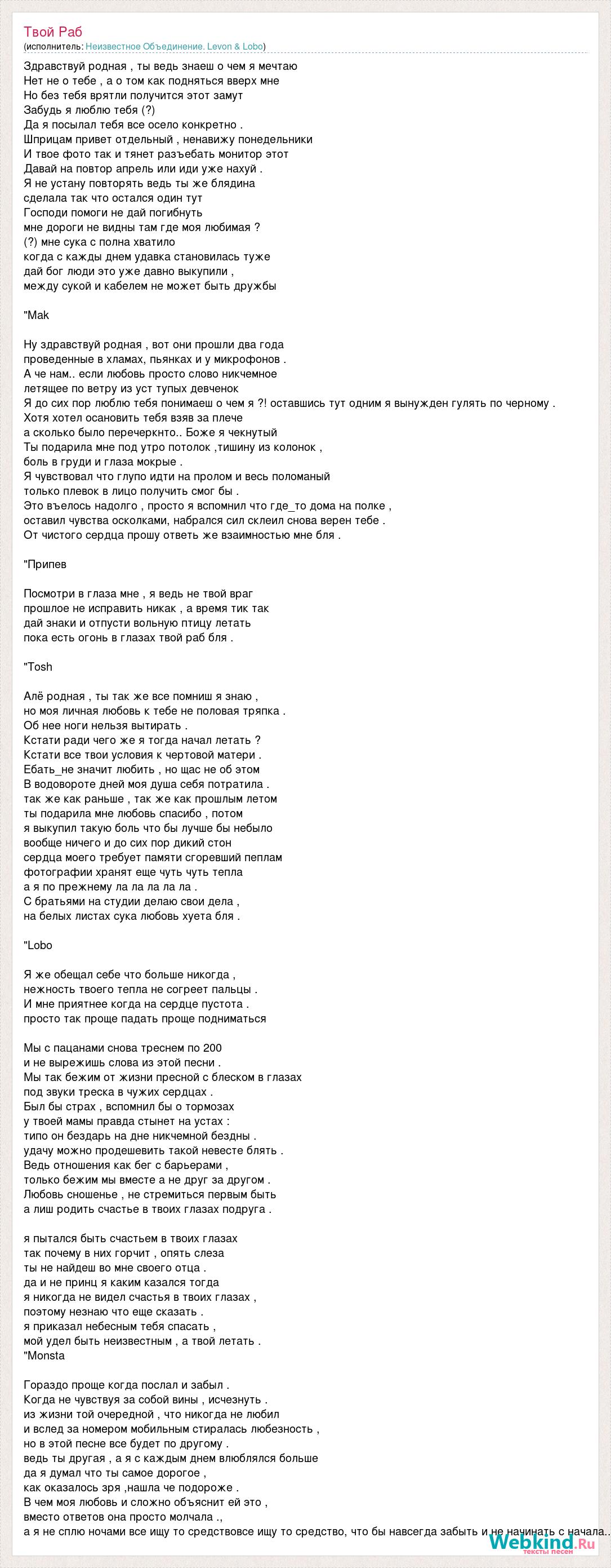 Здравствуй родная , ты ведь знаеш о чем я мечтаю Нет не о тебе , а о том как подняться вверх мне Но без тебя врятли получится этот замут Забудь я люблю тебя (?) Да я посылал тебя все осело конкретно . Шприцам привет отдельный , ненавижу понедельники И твое фото так и тянет разъебать монитор этот Давай на повтор апрель или иди уже нахуй . Я не устану повторять ведь ты же блядина сделала так что остался один тут Господи помоги не дай погибнуть мне дороги не видны там где моя любимая ? (?) мне сука с полна хватило когда с кажды днем удавка становилась туже дай бог люди это уже давно выкупили , между сукой и кабелем не может быть дружбы "Mak Ну здравствуй родная , вот они прошли два года проведенные в хламах, пьянках и у микрофонов . А че нам.. если любовь просто слово никчемное летящее по ветру из уст тупых девченок Я до сих пор люблю тебя понимаеш о чем я ?! оставшись тут одним я вынужден гулять по черному . Хотя хотел осановить тебя взяв за плече а сколько было перечеркнто.. Боже я чекнутый Ты подарила мне под утро потолок ,тишину из колонок , боль в груди и глаза мокрые . Я чувствовал что глупо идти на пролом и весь поломаный только плевок в лицо получить смог бы . Это въелось надолго , просто я вспомнил что где_то дома на полке , оставил чувства осколками, набрался сил склеил снова верен тебе . От чистого сердца прошу ответь же взаимностью мне бля . "Припев Посмотри в глаза мне , я ведь не твой враг прошлое не исправить никак , а время тик так дай знаки и отпусти вольную птицу летать пока есть огонь в глазах твой раб бля . "Tosh Алё родная , ты так же все помниш я знаю , но моя личная любовь к тебе не половая тряпка . Об нее ноги нельзя вытирать . Кстати ради чего же я тогда начал летать ? Кстати все твои условия к чертовой матери . Ебать_не значит любить , но щас не об этом В водовороте дней моя душа себя потратила . так же как раньше , так же как прошлым летом ты подарила мне любовь спасибо , потом я выкупил такую боль что бы лучше бы небыло вообще ничего и до сих пор дикий стон сердца моего требует памяти сгоревший пеплам фотографии хранят еще чуть чуть тепла а я по прежнему ла ла ла ла ла . С братьями на студии делаю свои дела , на белых листах сука любовь хуета бля . "Lobo Я же обещал себе что больше никогда , нежность твоего тепла не согреет пальцы . И мне приятнее когда на сердце пустота . просто так проще падать проще подниматься Мы с пацанами снова треснем по 200 и не вырежишь слова из этой песни . Мы так бежим от жизни пресной с блеском в глазах под звуки треска в чужих сердцах . Был бы страх , вспомнил бы о тормозах у твоей мамы правда стынет на устах : типо он бездарь на дне никчемной бездны . удачу можно продешевить такой невесте блять . Ведь отношения как бег с барьерами , только бежим мы вместе а не друг за другом . Любовь сношенье , не стремиться первым быть а лиш родить счастье в твоих глазах подруга . я пытался быть счастьем в твоих глазах так почему в них горчит , опять слеза ты не найдеш во мне своего отца . да и не принц я каким казался тогда я никогда не видел счастья в твоих глазах , поэтому незнаю что еще сказать . я приказал небесным тебя спасать , мой удел быть неизвестным , а твой летать . "Monsta Гораздо проще когда послал и забыл . Когда не чувствуя за собой вины , исчезнуть . из жизни той очередной , что никогда не любил и вслед за номером мобильным стиралась любезность , но в этой пе