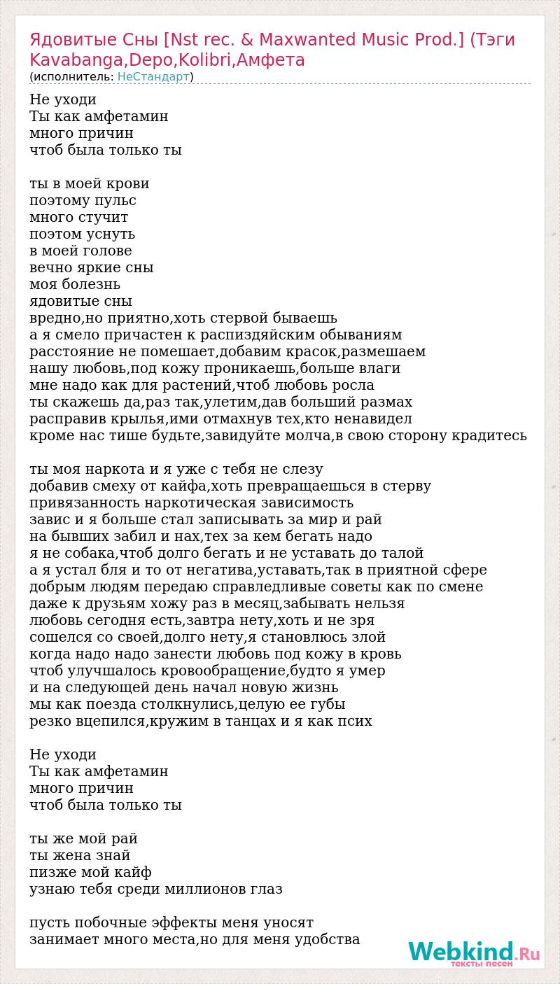 Не уходи Ты как амфетамин много причин чтоб была только ты ты в моей крови поэтому пульс много стучит поэтом уснуть в моей голове вечно яркие сны моя болезнь ядовитые сны вредно,но приятно,хоть стервой бываешь а я смело причастен к распиздяйским обываниям расстояние не помешает,добавим красок,размешаем нашу любовь,под кожу проникаешь,больше влаги мне надо как для растений,чтоб любовь росла ты скажешь да,раз так,улетим,дав больший размах расправив крылья,ими отмахнув тех,кто ненавидел кроме нас тише будьте,завидуйте молча,в свою сторону крадитесь ты моя наркота и я уже с тебя не слезу добавив смеху от кайфа,хоть превращаешься в стерву привязанность наркотическая зависимость завис и я больше стал записывать за мир и рай на бывших забил и нах,тех за кем бегать надо я не собака,чтоб долго бегать и не уставать до талой а я устал бля и то от негатива,уставать,так в приятной сфере добрым людям передаю справледливые советы как по смене даже к друзьям хожу раз в месяц,забывать нельзя любовь сегодня есть,завтра нету,хоть и не зря сошелся со своей,долго нету,я становлюсь злой когда надо надо занести любовь под кожу в кровь чтоб улучшалось кровообращение,будто я умер и на следующей день начал новую жизнь мы как поезда столкнулись,целую ее губы резко вцепился,кружим в танцах и я как псих Не уходи Ты как амфетамин много причин чтоб была только ты ты же мой рай ты жена знай пизже мой кайф узнаю тебя среди миллионов глаз пусть побочные эффекты меня уносят занимает много места,но для меня удобства