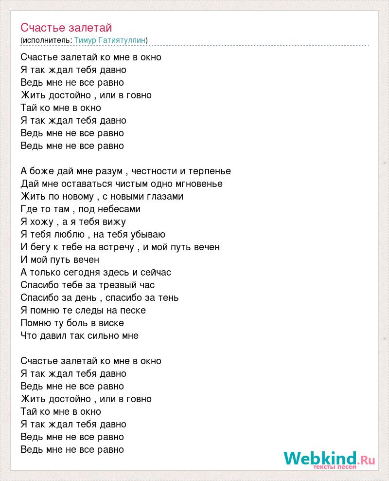 Счастье залетай ко мне в окно Я так ждал тебя давно Ведь мне не все равно Жить достойно , или в говно Тай ко мне в окно Я так ждал тебя давно Ведь мне не все равно Ведь мне не все равно А боже дай мне разум , честности и терпенье Дай мне оставаться чистым одно мгновенье Жить по новому , с новыми глазами Где то там , под небесами Я хожу , а я тебя вижу Я тебя люблю , на тебя убываю И бегу к тебе на встречу , и мой путь вечен И мой путь вечен А только сегодня здесь и сейчас Спасибо тебе за трезвый час Спасибо за день , спасибо за тень Я помню те следы на песке Помню ту боль в виске Что давил так сильно мне Счастье залетай ко мне в окно Я так ждал тебя давно Ведь мне не все равно Жить достойно , или в говно Тай ко мне в окно Я так ждал тебя давно Ведь мне не все равно Ведь мне не все равно