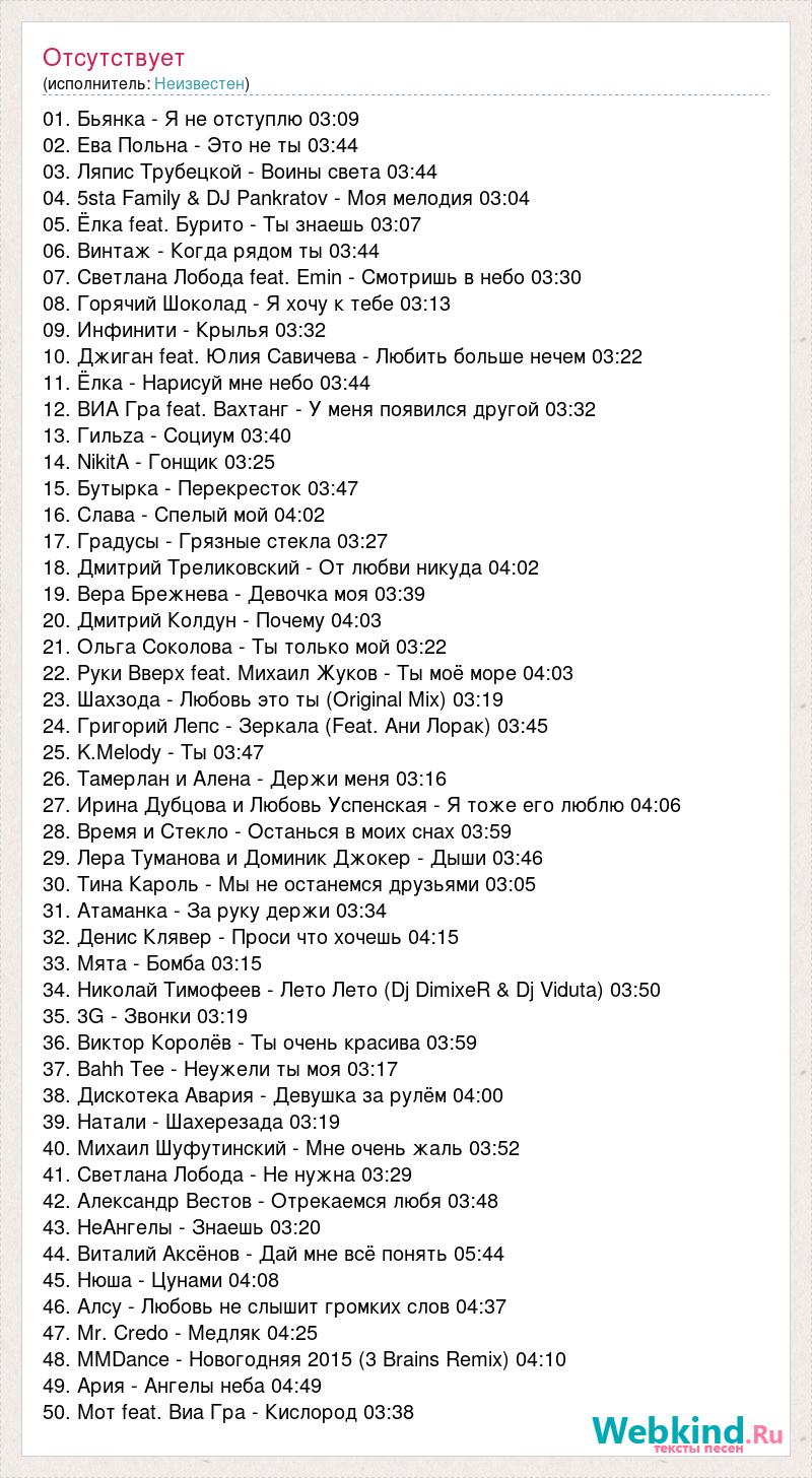 01. Бьянка - Я не отступлю 03:09 02. Ева Польна - Это не ты 03:44 03. Ляпис Трубецкой - Воины света 03:44 04. 5sta Family & DJ Pankratov - Моя мелодия 03:04 05. Ёлка feat. Бурито - Ты знаешь 03:07 06. Винтаж - Когда рядом ты 03:44 07. Светлана Лобода feat. Emin - Смотришь в небо 03:30 08. Горячий Шоколад - Я хочу к тебе 03:13 09. Инфинити - Крылья 03:32 10. Джиган feat. Юлия Савичева - Любить больше нечем 03:22 11. Ёлка - Нарисуй мне небо 03:44 12. ВИА Гра feat. Вахтанг - У меня появился другой 03:32 13. Гильzа - Социум 03:40 14. NikitA - Гонщик 03:25 15. Бутырка - Перекресток 03:47 16. Слава - Спелый мой 04:02 17. Градусы - Грязные стекла 03:27 18. Дмитрий Треликовский - От любви никуда 04:02 19. Вера Брежнева - Девочка моя 03:39 20. Дмитрий Колдун - Почему 04:03 21. Ольга Соколова - Ты только мой 03:22 22. Руки Вверх feat. Михаил Жуков - Ты моё море 04:03 23. Шахзода - Любовь это ты (Original Mix) 03:19 24. Григорий Лепс - Зеркала (Feat. Ани Лорак) 03:45 25. K.Melody - Ты 03:47 26. Тамерлан и Алена - Держи меня 03:16 27. Ирина Дубцова и Любовь Успенская - Я тоже его люблю 04:06 28. Время и Стекло - Останься в моих снах 03:59 29. Лера Туманова и Доминик Джокер - Дыши 03:46 30. Тина Кароль - Мы не останемся друзьями 03:05 31. Атаманка - За руку держи 03:34 32. Денис Клявер - Проси что хочешь 04:15 33. Мята - Бомба 03:15 34. Николай Тимофеев - Лето Лето (Dj DimixeR & Dj Viduta) 03:50 35. 3G - Звонки 03:19 36. Виктор Королёв - Ты очень красива 03:59 37. Bahh Tee - Неужели ты моя 03:17 38. Дискотека Авария - Девушка за рулём 04:00 39. Натали - Шахерезада 03:19 40. Михаил Шуфутинский - Мне очень жаль 03:52 41. Светлана Лобода - Не нужна 03:29 42. Александр Вестов - Отрекаемся любя 03:48 43. НеАнгелы - Знаешь 03:20 44. Виталий Аксёнов - Дай мне всё понять 05:44 45. Нюша - Цунами 04:08 46. Алсу - Любовь не слышит громких слов 04:37 47. Mr. Credo - Медляк 04:25 48. MMDance - Новогодняя 2015 (3 Brains Remix) 04:10 49. Ария - Ангелы неба 04:49 50. Мот feat. Виа Гра - Кислород 03:38
