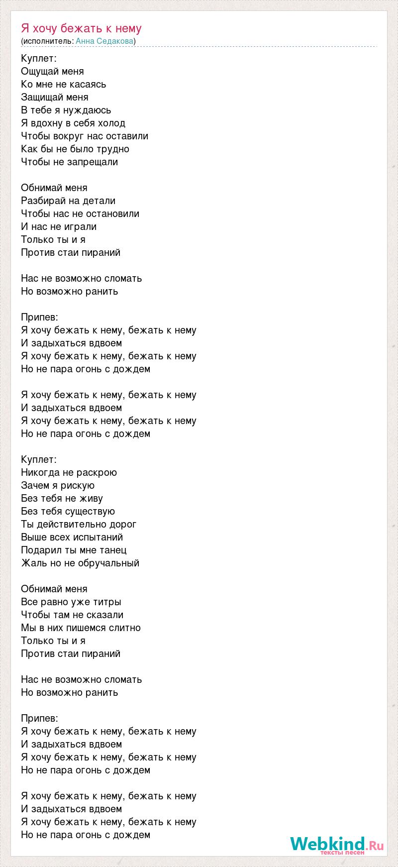 Куплет: Ощущай меня Ко мне не касаясь Защищай меня В тебе я нуждаюсь Я вдохну в себя холод Чтобы вокруг нас оставили Как бы не было трудно Чтобы не запрещали Обнимай меня Разбирай на детали Чтобы нас не остановили И нас не играли Только ты и я Против стаи пираний Нас не возможно сломать Но возможно ранить Припев: Я хочу бежать к нему, бежать к нему И задыхаться вдвоем Я хочу бежать к нему, бежать к нему Но не пара огонь с дождем Я хочу бежать к нему, бежать к нему И задыхаться вдвоем Я хочу бежать к нему, бежать к нему Но не пара огонь с дождем Куплет: Никогда не раскрою Зачем я рискую Без тебя не живу Без тебя существую Ты действительно дорог Выше всех испытаний Подарил ты мне танец Жаль но не обручальный Обнимай меня Все равно уже титры Чтобы там не сказали Мы в них пишемся слитно Только ты и я Против стаи пираний Нас не возможно сломать Но возможно ранить Припев: Я хочу бежать к нему, бежать к нему И задыхаться вдвоем Я хочу бежать к нему, бежать к нему Но не пара огонь с дождем Я хочу бежать к нему, бежать к нему И задыхаться вдвоем Я хочу бежать к нему, бежать к нему Но не пара огонь с дождем