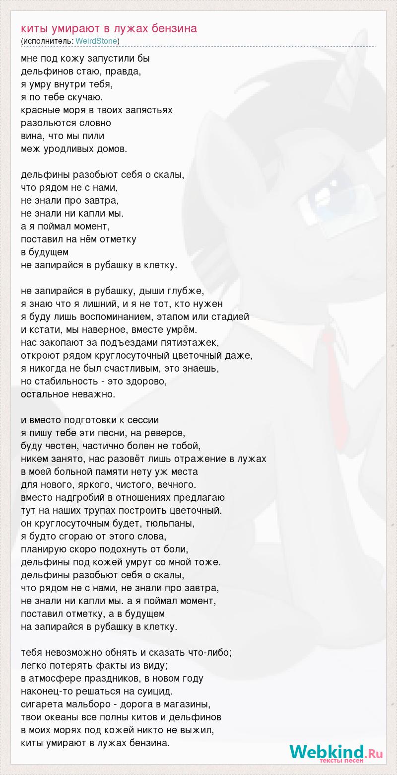 мне под кожу запустили бы дельфинов стаю, правда, я умру внутри тебя, я по тебе скучаю. красные моря в твоих запястьях разольются словно вина, что мы пили меж уродливых домов. дельфины разобьют себя о скалы, что рядом не с нами, не знали про завтра, не знали ни капли мы. а я поймал момент, поставил на нём отметку в будущем не запирайся в рубашку в клетку. не запирайся в рубашку, дыши глубже, я знаю что я лишний, и я не тот, кто нужен я буду лишь воспоминанием, этапом или стадией и кстати, мы наверное, вместе умрём. нас закопают за подъездами пятиэтажек, откроют рядом круглосуточный цветочный даже, я никогда не был счастливым, это знаешь, но стабильность - это здорово, остальное неважно. и вместо подготовки к сессии я пишу тебе эти песни, на реверсе, буду честен, частично болен не тобой, никем занято, нас разовёт лишь отражение в лужах в моей больной памяти нету уж места для нового, яркого, чистого, вечного. вместо надгробий в отношениях предлагаю тут на наших трупах построить цветочный. он круглосуточным будет, тюльпаны, я будто сгораю от этого слова, планирую скоро подохнуть от боли, дельфины под кожей умрут со мной тоже. дельфины разобьют себя о скалы, что рядом не с нами, не знали про завтра, не знали ни капли мы. а я поймал момент, поставил отметку, а в будущем на запирайся в рубашку в клетку. тебя невозможно обнять и сказать что-либо; легко потерять факты из виду; в атмосфере праздников, в новом году наконец-то решаться на суицид. сигарета мальборо - дорога в магазины, твои океаны все полны китов и дельфинов в моих морях под кожей никто не выжил, киты умирают в лужах бензина.
