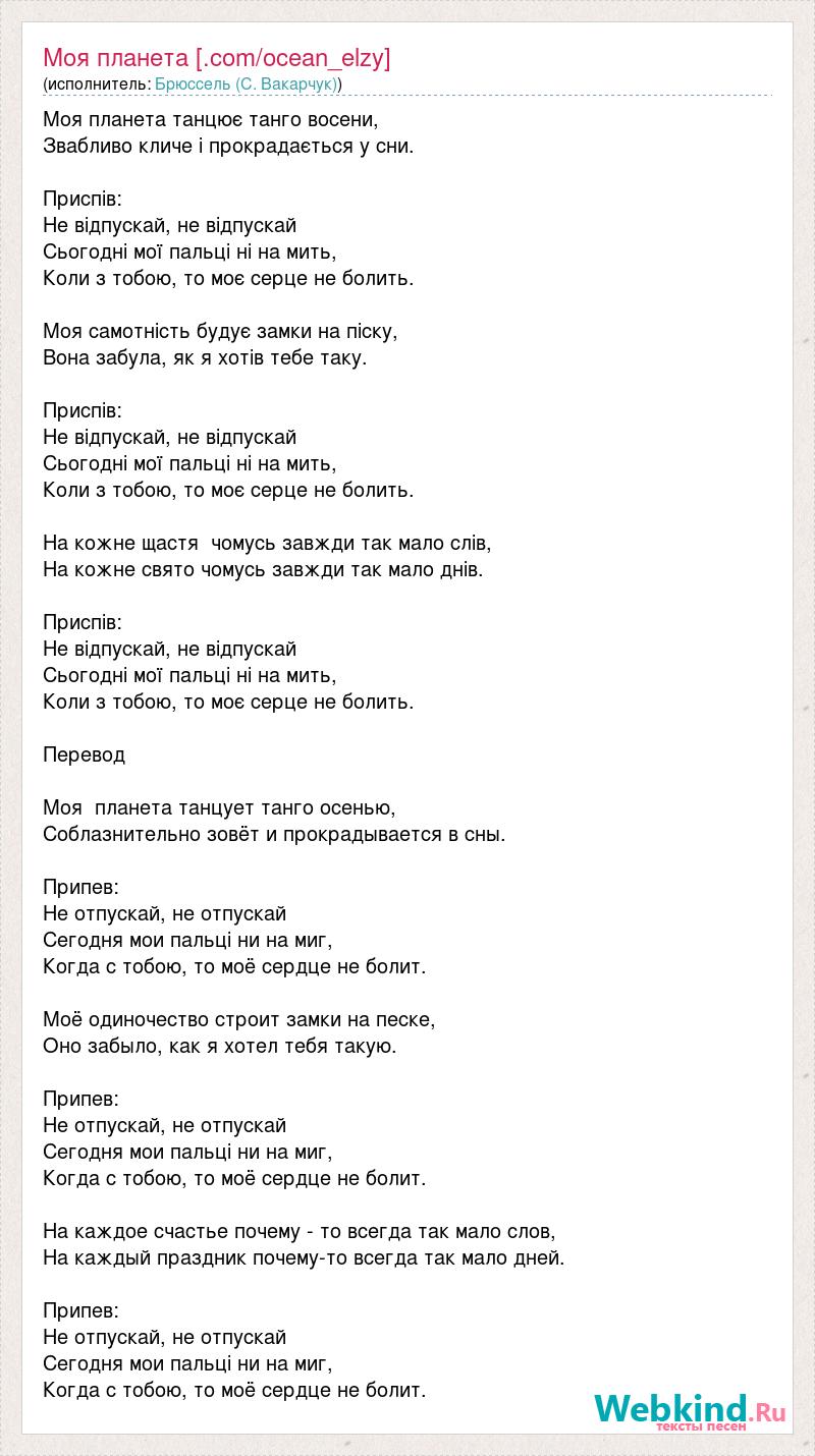 Моя планета танцює танго восени, Звабливо кличе і прокрадається у сни. Приспів: Не відпускай, не відпускай Сьогодні мої пальці ні на мить, Коли з тобою, то моє серце не болить. Моя самотність будує замки на піску, Вона забула, як я хотів тебе таку. Приспів: Не відпускай, не відпускай Сьогодні мої пальці ні на мить, Коли з тобою, то моє серце не болить. На кожне щастя чомусь завжди так мало слів, На кожне свято чомусь завжди так мало днів. Приспів: Не відпускай, не відпускай Сьогодні мої пальці ні на мить, Коли з тобою, то моє серце не болить. Перевод Моя планета танцует танго осенью, Соблазнительно зовёт и прокрадывается в сны. Припев: Не отпускай, не отпускай Сегодня мои пальці ни на миг, Когда с тобою, то моё сердце не болит. Моё одиночество строит замки на песке, Оно забыло, как я хотел тебя такую. Припев: Не отпускай, не отпускай Сегодня мои пальці ни на миг, Когда с тобою, то моё сердце не болит. На каждое счастье почему - то всегда так мало слов, На каждый праздник почему-то всегда так мало дней. Припев: Не отпускай, не отпускай Сегодня мои пальці ни на миг, Когда с тобою, то моё сердце не болит.
