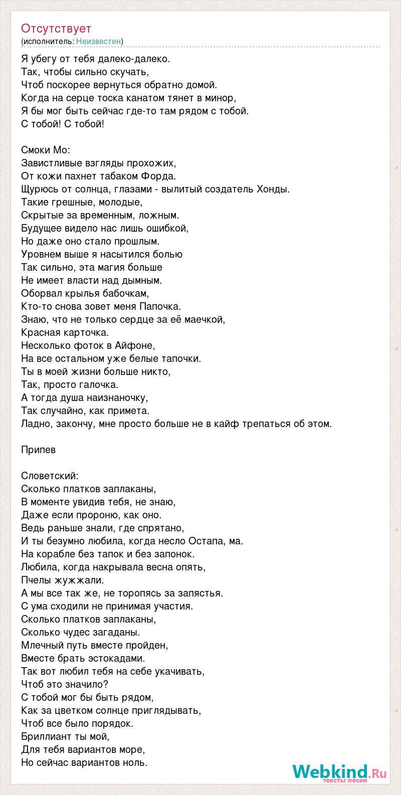 Я убегу от тебя далеко-далеко. Так, чтобы сильно скучать, Чтоб поскорее вернуться обратно домой. Когда на серце тоска канатом тянет в минор, Я бы мог быть сейчас где-то там рядом с тобой. С тобой! С тобой! Смоки Мо: Завистливые взгляды прохожих, От кожи пахнет табаком Форда. Щурюсь от солнца, глазами - вылитый создатель Хонды. Такие грешные, молодые, Скрытые за временным, ложным. Будущее видело нас лишь ошибкой, Но даже оно стало прошлым. Уровнем выше я насытился болью Так сильно, эта магия больше Не имеет власти над дымным. Оборвал крылья бабочкам, Кто-то снова зовет меня Папочка. Знаю, что не только сердце за её маечкой, Красная карточка. Несколько фоток в Айфоне, На все остальном уже белые тапочки. Ты в моей жизни больше никто, Так, просто галочка. А тогда душа наизнаночку, Так случайно, как примета. Ладно, закончу, мне просто больше не в кайф трепаться об этом. Припев Словетский: Сколько платков заплаканы, В моменте увидив тебя, не знаю, Даже если пророню, как оно. Ведь раньше знали, где спрятано, И ты безумно любила, когда несло Остапа, ма. На корабле без тапок и без запонок. Любила, когда накрывала весна опять, Пчелы жужжали. А мы все так же, не торопясь за запястья. С ума сходили не принимая участия. Сколько платков заплаканы, Сколько чудес загаданы. Млечный путь вместе пройден, Вместе брать эстокадами. Так вот любил тебя на себе укачивать, Чтоб это значило? С тобой мог бы быть рядом, Как за цветком солнце приглядывать, Чтоб все было порядок. Бриллиант ты мой, Для тебя вариантов море, Но сейчас вариантов ноль.