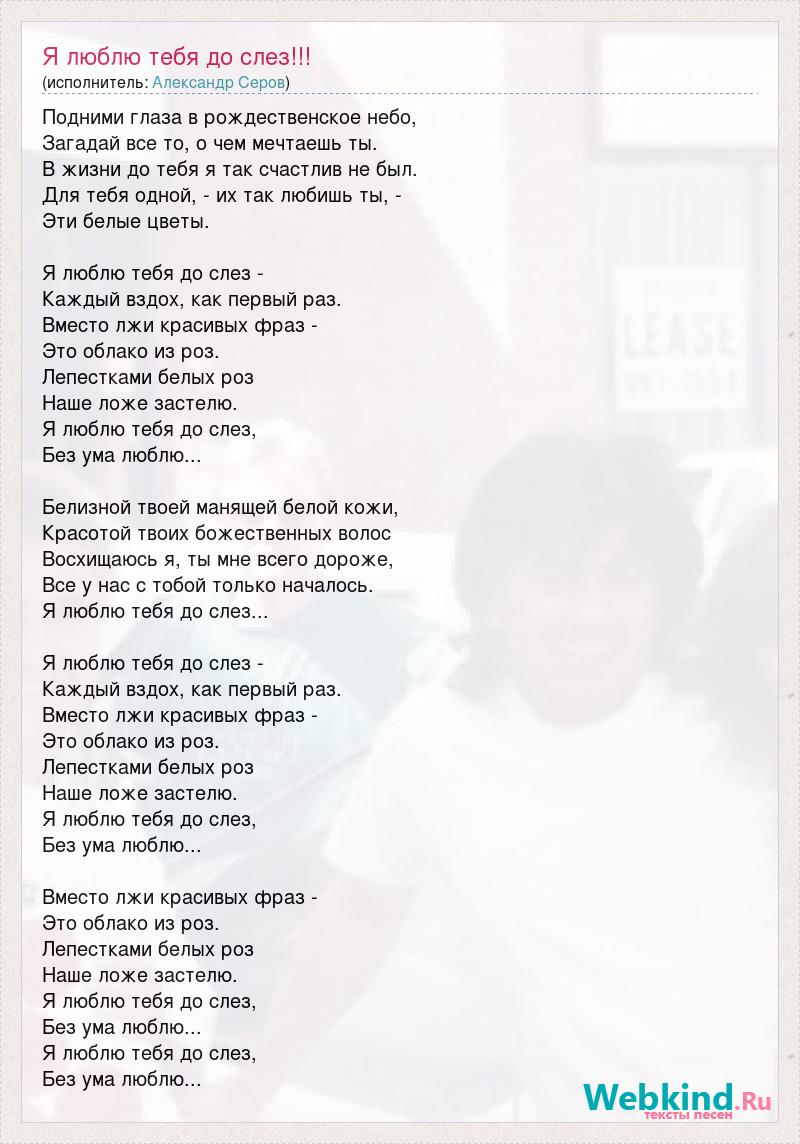 Подними глаза в рождественское небо, Загадай все то, о чем мечтаешь ты. В жизни до тебя я так счастлив не был. Для тебя одной, - их так любишь ты, - Эти белые цветы. Я люблю тебя до слез - Каждый вздох, как первый раз. Вместо лжи красивых фраз - Это облако из роз. Лепестками белых роз Наше ложе застелю. Я люблю тебя до слез, Без ума люблю... Белизной твоей манящей белой кожи, Красотой твоих божественных волос Восхищаюсь я, ты мне всего дороже, Все у нас с тобой только началось. Я люблю тебя до слез... Я люблю тебя до слез - Каждый вздох, как первый раз. Вместо лжи красивых фраз - Это облако из роз. Лепестками белых роз Наше ложе застелю. Я люблю тебя до слез, Без ума люблю... Вместо лжи красивых фраз - Это облако из роз. Лепестками белых роз Наше ложе застелю. Я люблю тебя до слез, Без ума люблю... Я люблю тебя до слез, Без ума люблю...