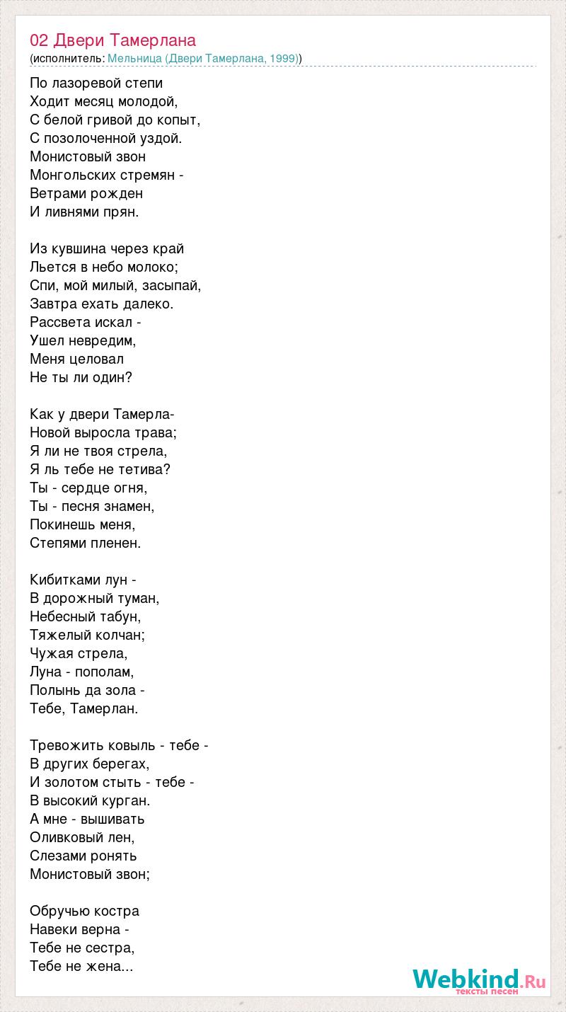 По лазоревой степи Ходит месяц молодой, С белой гривой до копыт, С позолоченной уздой. Монистовый звон Монгольских стремян - Ветрами рожден И ливнями прян. Из кувшина через край Льется в небо молоко; Спи, мой милый, засыпай, Завтра ехать далеко. Рассвета искал - Ушел невредим, Меня целовал Не ты ли один? Как у двери Тамерла- Новой выросла трава; Я ли не твоя стрела, Я ль тебе не тетива? Ты - сердце огня, Ты - песня знамен, Покинешь меня, Степями пленен. Кибитками лун - В дорожный туман, Небесный табун, Тяжелый колчан; Чужая стрела, Луна - пополам, Полынь да зола - Тебе, Тамерлан. Тревожить ковыль - тебе - В других берегах, И золотом стыть - тебе - В высокий курган. А мне - вышивать Оливковый лен, Слезами ронять Монистовый звон; Обручью костра Навеки верна - Тебе не сестра, Тебе не жена...
