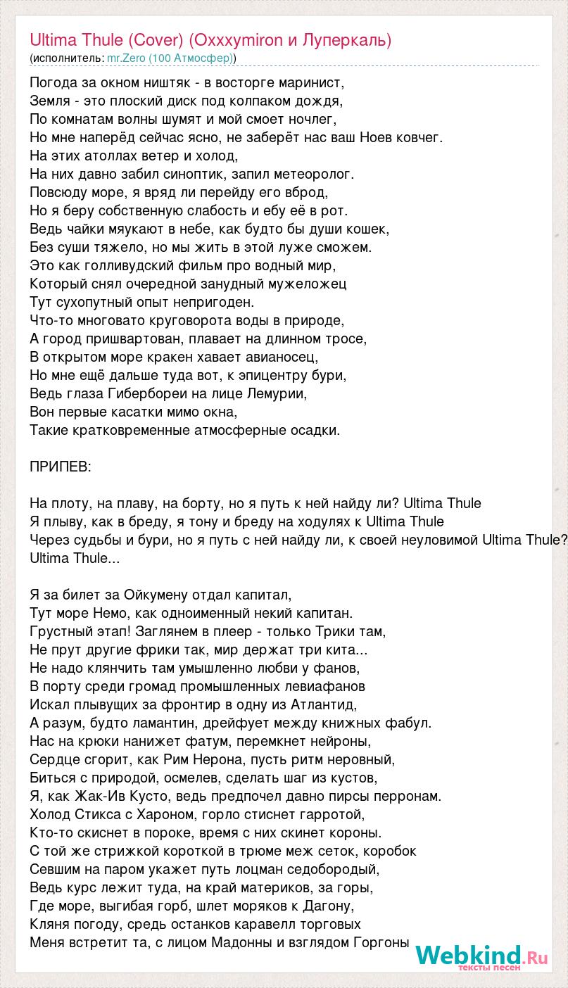 Погода за окном ништяк - в восторге маринист, Земля - это плоский диск под колпаком дождя, По комнатам волны шумят и мой смоет ночлег, Но мне наперёд сейчас ясно, не заберёт нас ваш Ноев ковчег. На этих атоллах ветер и холод, На них давно забил синоптик, запил метеоролог. Повсюду море, я вряд ли перейду его вброд, Но я беру собственную слабость и ебу её в рот. Ведь чайки мяукают в небе, как будто бы души кошек, Без суши тяжело, но мы жить в этой луже сможем. Это как голливудский фильм про водный мир, Который снял очередной занудный мужеложец Тут сухопутный опыт непригоден. Что-то многовато круговорота воды в природе, А город пришвартован, плавает на длинном тросе, В открытом море кракен хавает авианосец, Но мне ещё дальше туда вот, к эпицентру бури, Ведь глаза Гибербореи на лице Лемурии, Вон первые касатки мимо окна, Такие кратковременные атмосферные осадки. ПРИПЕВ: На плоту, на плаву, на борту, но я путь к ней найду ли? Ultima Thule Я плыву, как в бреду, я тону и бреду на ходулях к Ultima Thule Через судьбы и бури, но я путь с ней найду ли, к своей неуловимой Ultima Thule? Ultima Thule... Я за билет за Ойкумену отдал капитал, Тут море Немо, как одноименный некий капитан. Грустный этап! Заглянем в плеер - только Трики там, Не прут другие фрики так, мир держат три кита... Не надо клянчить там умышленно любви у фанов, В порту среди громад промышленных левиафанов Искал плывущих за фронтир в одну из Атлантид, А разум, будто ламантин, дрейфует между книжных фабул. Нас на крюки нанижет фатум, перемкнет нейроны, Сердце сгорит, как Рим Нерона, пусть ритм неровный, Биться с природой, осмелев, сделать шаг из кустов, Я, как Жак-Ив Кусто, ведь предпочел давно пирсы перронам. Холод Стикса с Хароном, горло стиснет гарротой, Кто-то скиснет в пороке, время с них скинет короны. С той же стрижкой короткой в трюме меж сеток, коробок Севшим на паром укажет путь лоцман седобородый, Ведь курс лежит туда, на край материков, за горы, Где море, выгибая горб, шлет моряков к Дагону, Кляня погоду, средь останков каравелл торговых Меня встретит та, с лицом Мадонны и взглядом Горгоны