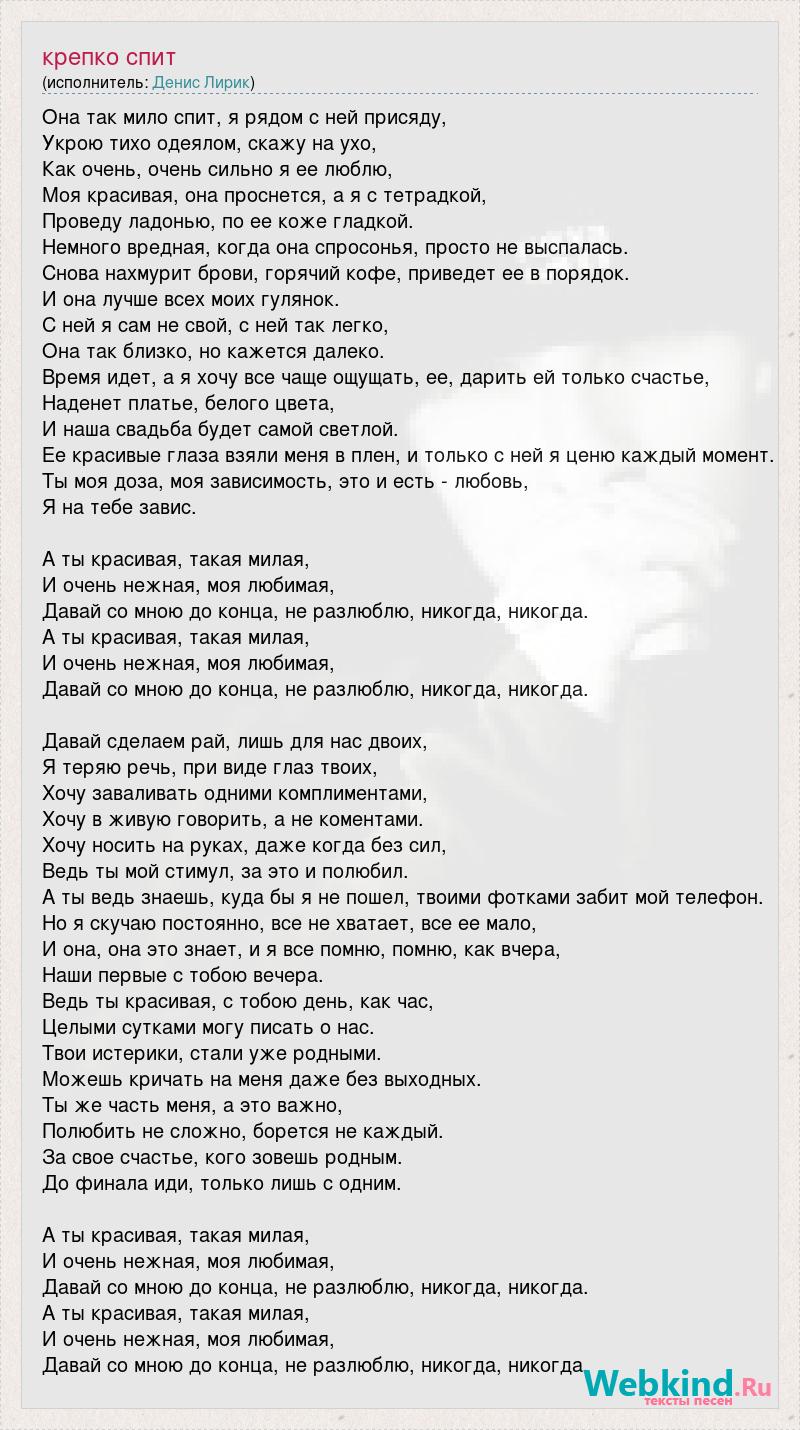 Она так мило спит, я рядом с ней присяду, Укрою тихо одеялом, скажу на ухо, Как очень, очень сильно я ее люблю, Моя красивая, она проснется, а я с тетрадкой, Проведу ладонью, по ее коже гладкой. Немного вредная, когда она спросонья, просто не выспалась. Снова нахмурит брови, горячий кофе, приведет ее в порядок. И она лучше всех моих гулянок. С ней я сам не свой, с ней так легко, Она так близко, но кажется далеко. Время идет, а я хочу все чаще ощущать, ее, дарить ей только счастье, Наденет платье, белого цвета, И наша свадьба будет самой светлой. Ее красивые глаза взяли меня в плен, и только с ней я ценю каждый момент. Ты моя доза, моя зависимость, это и есть - любовь, Я на тебе завис. А ты красивая, такая милая, И очень нежная, моя любимая, Давай со мною до конца, не разлюблю, никогда, никогда. А ты красивая, такая милая, И очень нежная, моя любимая, Давай со мною до конца, не разлюблю, никогда, никогда. Давай сделаем рай, лишь для нас двоих, Я теряю речь, при виде глаз твоих, Хочу заваливать одними комплиментами, Хочу в живую говорить, а не коментами. Хочу носить на руках, даже когда без сил, Ведь ты мой стимул, за это и полюбил. А ты ведь знаешь, куда бы я не пошел, твоими фотками забит мой телефон. Но я скучаю постоянно, все не хватает, все ее мало, И она, она это знает, и я все помню, помню, как вчера, Наши первые с тобою вечера. Ведь ты красивая, с тобою день, как час, Целыми сутками могу писать о нас. Твои истерики, стали уже родными. Можешь кричать на меня даже без выходных. Ты же часть меня, а это важно, Полюбить не сложно, борется не каждый. За свое счастье, кого зовешь родным. До финала иди, только лишь с одним. А ты красивая, такая милая, И очень нежная, моя любимая, Давай со мною до конца, не разлюблю, никогда, никогда. А ты красивая, такая милая, И очень нежная, моя любимая, Давай со мною до конца, не разлюблю, никогда, никогда.