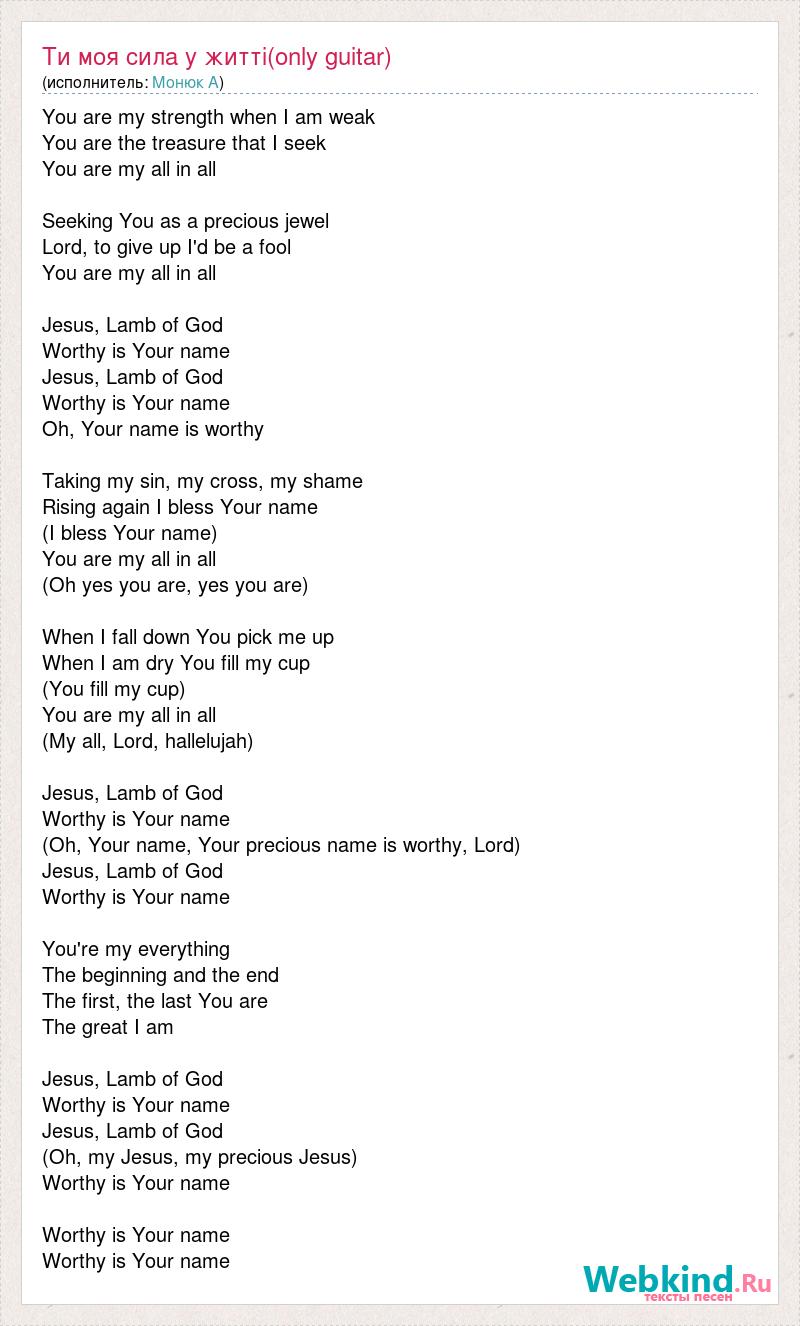 You are my strength when I am weak You are the treasure that I seek You are my all in all Seeking You as a precious jewel Lord, to give up I'd be a fool You are my all in all Jesus, Lamb of God Worthy is Your name Jesus, Lamb of God Worthy is Your name Oh, Your name is worthy Taking my sin, my cross, my shame Rising again I bless Your name (I bless Your name) You are my all in all (Oh yes you are, yes you are) When I fall down You pick me up When I am dry You fill my cup (You fill my cup) You are my all in all (My all, Lord, hallelujah) Jesus, Lamb of God Worthy is Your name (Oh, Your name, Your precious name is worthy, Lord) Jesus, Lamb of God Worthy is Your name You're my everything The beginning and the end The first, the last You are The great I am Jesus, Lamb of God Worthy is Your name Jesus, Lamb of God (Oh, my Jesus, my precious Jesus) Worthy is Your name Worthy is Your name Worthy is Your name