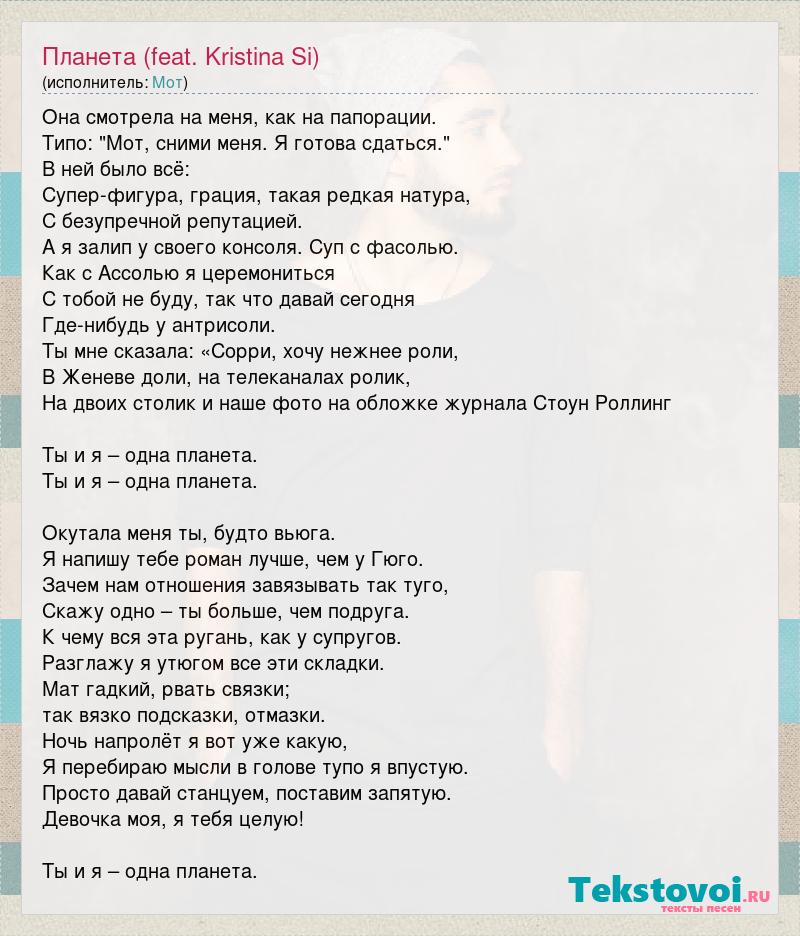 Она смотрела на меня, как на папорации. Типо: "Мот, сними меня. Я готова сдаться." В ней было всё: Супер-фигура, грация, такая редкая натура, С безупречной репутацией. А я залип у своего консоля. Суп с фасолью. Как с Ассолью я церемониться С тобой не буду, так что давай сегодня Где-нибудь у антрисоли. Ты мне сказала: «Сорри, хочу нежнее роли, В Женеве доли, на телеканалах ролик, На двоих столик и наше фото на обложке журнала Стоун Роллинг Ты и я – одна планета. Ты и я – одна планета. Окутала меня ты, будто вьюга. Я напишу тебе роман лучше, чем у Гюго. Зачем нам отношения завязывать так туго, Скажу одно – ты больше, чем подруга. К чему вся эта ругань, как у супругов. Разглажу я утюгом все эти складки. Мат гадкий, рвать связки; так вязко подсказки, отмазки. Ночь напролёт я вот уже какую, Я перебираю мысли в голове тупо я впустую. Просто давай станцуем, поставим запятую. Девочка моя, я тебя целую! Ты и я – одна планета.