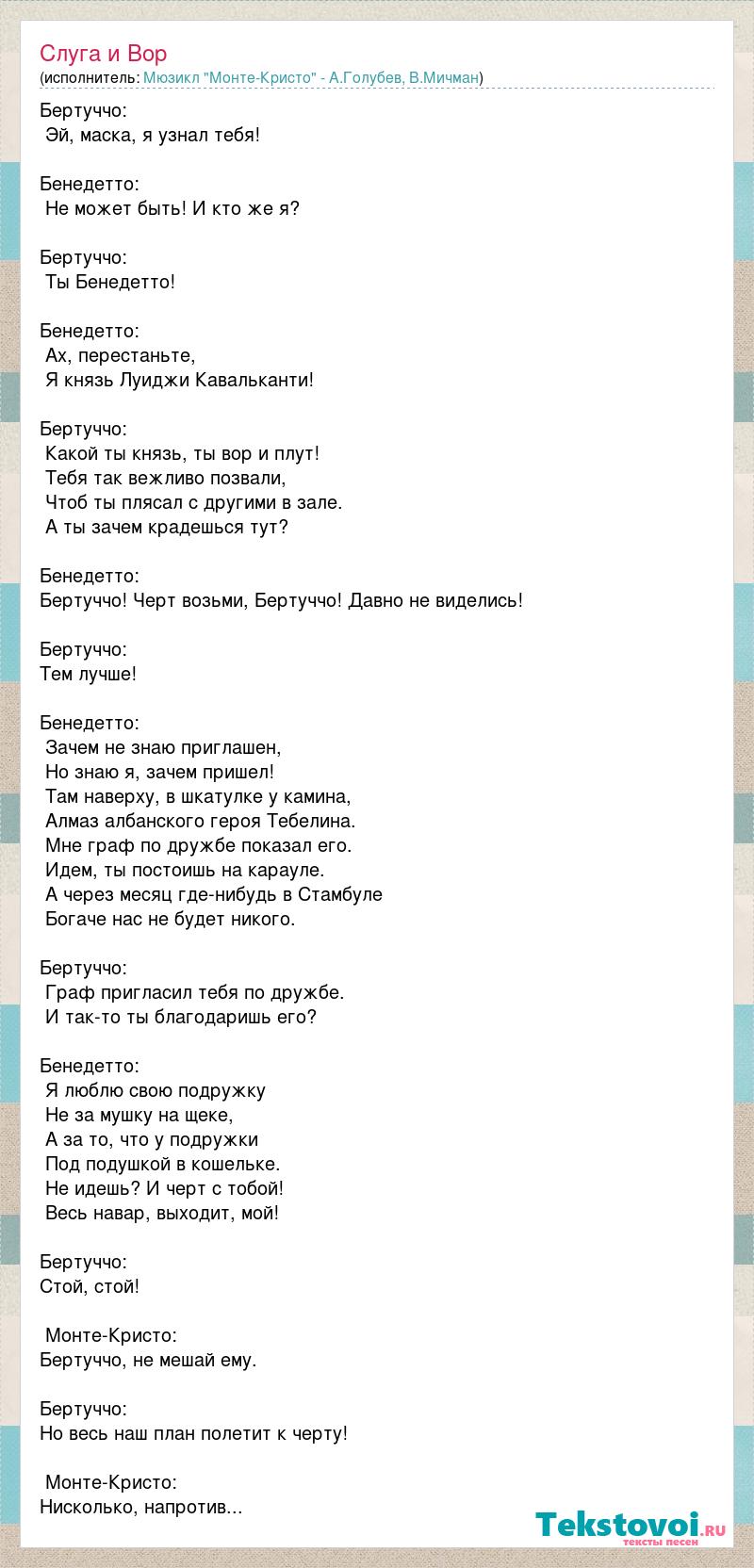 Бертуччо: Эй, маска, я узнал тебя! Бенедетто: Не может быть! И кто же я? Бертуччо: Ты Бенедетто! Бенедетто: Ах, перестаньте, Я князь Луиджи Кавальканти! Бертуччо: Какой ты князь, ты вор и плут! Тебя так вежливо позвали, Чтоб ты плясал с другими в зале. А ты зачем крадешься тут? Бенедетто: Бертуччо! Черт возьми, Бертуччо! Давно не виделись! Бертуччо: Тем лучше! Бенедетто: Зачем не знаю приглашен, Но знаю я, зачем пришел! Там наверху, в шкатулке у камина, Алмаз албанского героя Тебелина. Мне граф по дружбе показал его. Идем, ты постоишь на карауле. А через месяц где-нибудь в Стамбуле Богаче нас не будет никого. Бертуччо: Граф пригласил тебя по дружбе. И так-то ты благодаришь его? Бенедетто: Я люблю свою подружку Не за мушку на щеке, А за то, что у подружки Под подушкой в кошельке. Не идешь? И черт с тобой! Весь навар, выходит, мой! Бертуччо: Стой, стой! Монте-Кристо: Бертуччо, не мешай ему. Бертуччо: Но весь наш план полетит к черту! Монте-Кристо: Нисколько, напротив...
