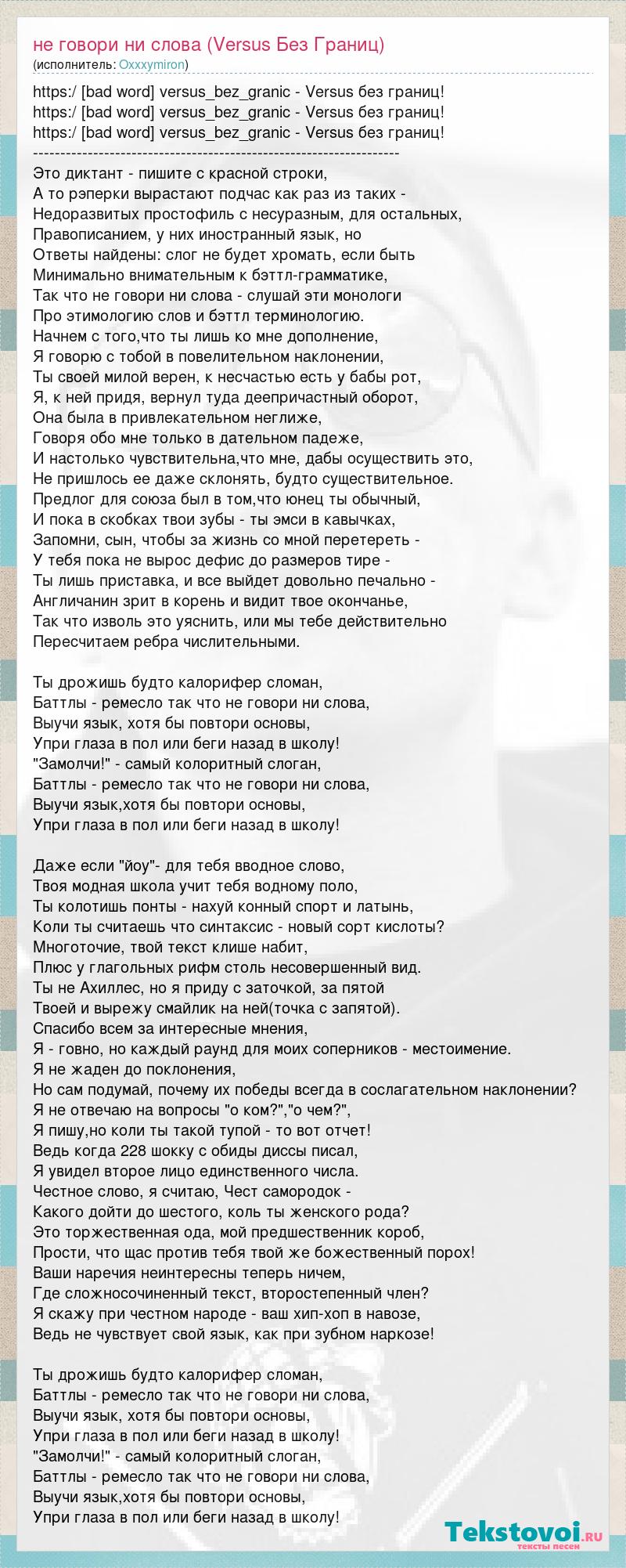 https:/ [bad word] versus_bez_granic - Versus без границ! https:/ [bad word] versus_bez_granic - Versus без границ! https:/ [bad word] versus_bez_granic - Versus без границ! ------------------------------------------------------------------- Это диктант - пишите с красной строки, А то рэперки вырастают подчас как раз из таких - Недоразвитых простофиль с несуразным, для остальных, Правописанием, у них иностранный язык, но Ответы найдены: слог не будет хромать, если быть Минимально внимательным к бэттл-грамматике, Так что не говори ни слова - слушай эти монологи Про этимологию слов и бэттл терминологию. Начнем с того,что ты лишь ко мне дополнение, Я говорю с тобой в повелительном наклонении, Ты своей милой верен, к несчастью есть у бабы рот, Я, к ней придя, вернул туда деепричастный оборот, Она была в привлекательном неглиже, Говоря обо мне только в дательном падеже, И настолько чувствительна,что мне, дабы осуществить это, Не пришлось ее даже склонять, будто существительное. Предлог для союза был в том,что юнец ты обычный, И пока в скобках твои зубы - ты эмси в кавычках, Запомни, сын, чтобы за жизнь со мной перетереть - У тебя пока не вырос дефис до размеров тире - Ты лишь приставка, и все выйдет довольно печально - Англичанин зрит в корень и видит твое окончанье, Так что изволь это уяснить, или мы тебе действительно Пересчитаем ребра числительными. Ты дрожишь будто калорифер сломан, Баттлы - ремесло так что не говори ни слова, Выучи язык, хотя бы повтори основы, Упри глаза в пол или беги назад в школу! "Замолчи!" - самый колоритный слоган, Баттлы - ремесло так что не говори ни слова, Выучи язык,хотя бы повтори основы, Упри глаза в пол или беги назад в школу! Даже если "йоу"- для тебя вводное слово, Твоя модная школа учит тебя водному поло, Ты колотишь понты - нахуй конный спорт и латынь, Коли ты считаешь что синтаксис - новый сорт кислоты? Многоточие, твой текст клише набит, Плюс у глагольных рифм столь несовершенный вид. Ты не Ахиллес, но я приду с заточкой, за пятой Твоей и вырежу смайлик на ней(точка с запятой). Спасибо всем за интересные мнения, Я - говно, но каждый раунд для моих соперников - местоимение. Я не жаден до поклонения, Но сам подумай, почему их победы всегда в сослагательном наклонении? Я не отвечаю на вопросы "о ком?","о чем?", Я пишу,но коли ты такой тупой - то вот отчет! Ведь когда 228 шокку с обиды диссы писал, Я увидел второе лицо единственного числа. Честное слово, я считаю, Чест самородок - Какого дойти до шестого, коль ты женского рода? Это торжественная ода, мой предшественник короб, Прости, что щас против тебя твой же божественный порох! Ваши наречия неинтересны теперь ничем, Где сложносочиненный текст, второстепенный член? Я скажу при честном народе - ваш хип-хоп в навозе, Ведь не чувствует свой язык, как при зубном наркозе! Ты дрожишь будто калорифер сломан, Баттлы - ремесло так что не говори ни слова, Выучи язык, хотя бы повтори основы, Упри глаза в пол или беги назад в школу! "Замолчи!" - самый колоритный слоган, Баттлы - ремесло так что не говори ни слова, Выучи язык,хотя бы повтори основы, Упри глаза в пол или беги назад в школу!