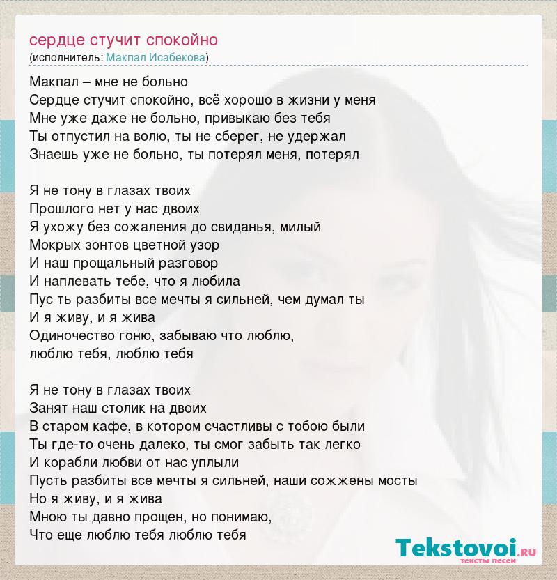 Макпал – мне не больно Сердце стучит спокойно, всё хорошо в жизни у меня Мне уже даже не больно, привыкаю без тебя Ты отпустил на волю, ты не сберег, не удержал Знаешь уже не больно, ты потерял меня, потерял Я не тону в глазах твоих Прошлого нет у нас двоих Я ухожу без сожаления до свиданья, милый Мокрых зонтов цветной узор И наш прощальный разговор И наплевать тебе, что я любила Пус ть разбиты все мечты я сильней, чем думал ты И я живу, и я жива Одиночество гоню, забываю что люблю, люблю тебя, люблю тебя Я не тону в глазах твоих Занят наш столик на двоих В старом кафе, в котором счастливы с тобою были Ты где-то очень далеко, ты смог забыть так легко И корабли любви от нас уплыли Пусть разбиты все мечты я сильней, наши сожжены мосты Но я живу, и я жива Мною ты давно прощен, но понимаю, Что еще люблю тебя люблю тебя