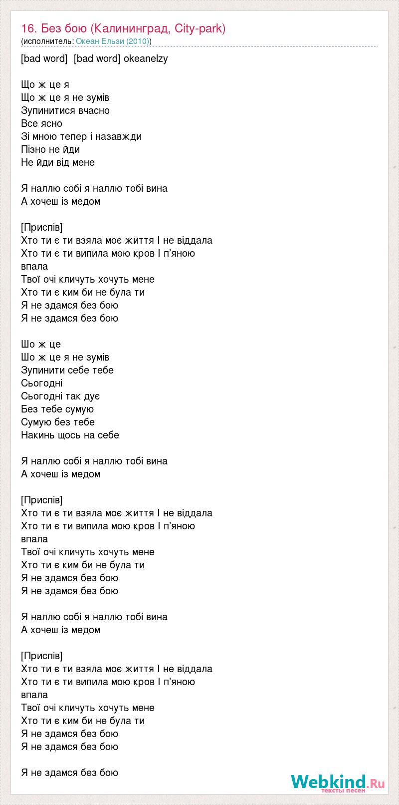 [bad word] [bad word] okeanelzy Що ж це я Що ж це я не зумів Зупинитися вчасно Все ясно Зі мною тепер і назавжди Пізно не йди Не йди від мене Я наллю собі я наллю тобі вина А хочеш із медом [Приспів] Хто ти є ти взяла моє життя І не віддала Хто ти є ти випила мою кров І п’яною впала Твої очі кличуть хочуть мене Хто ти є ким би не була ти Я не здамся без бою Я не здамся без бою Шо ж це Шо ж це я не зумів Зупинити себе тебе Сьогодні Сьогодні так дує Без тебе сумую Сумую без тебе Накинь щось на себе Я наллю собі я наллю тобі вина А хочеш із медом [Приспів] Хто ти є ти взяла моє життя І не віддала Хто ти є ти випила мою кров І п’яною впала Твої очі кличуть хочуть мене Хто ти є ким би не була ти Я не здамся без бою Я не здамся без бою Я наллю собі я наллю тобі вина А хочеш із медом [Приспів] Хто ти є ти взяла моє життя І не віддала Хто ти є ти випила мою кров І п’яною впала Твої очі кличуть хочуть мене Хто ти є ким би не була ти Я не здамся без бою Я не здамся без бою Я не здамся без бою