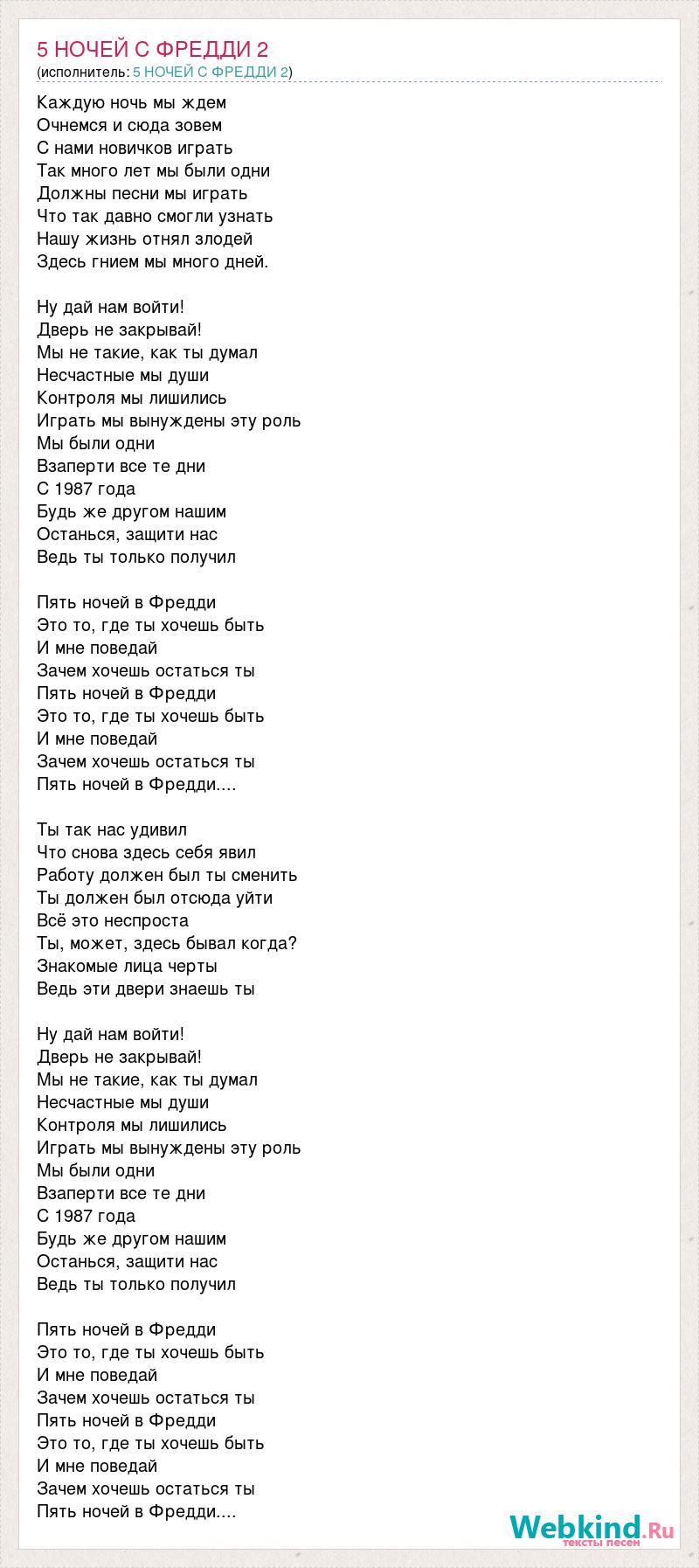 Каждую ночь мы ждем Очнемся и сюда зовем С нами новичков играть Так много лет мы были одни Должны песни мы играть Что так давно смогли узнать Нашу жизнь отнял злодей Здесь гнием мы много дней. Ну дай нам войти! Дверь не закрывай! Мы не такие, как ты думал Несчастные мы души Контроля мы лишились Играть мы вынуждены эту роль Мы были одни Взаперти все те дни С 1987 года Будь же другом нашим Останься, защити нас Ведь ты только получил Пять ночей в Фредди Это то, где ты хочешь быть И мне поведай Зачем хочешь остаться ты Пять ночей в Фредди Это то, где ты хочешь быть И мне поведай Зачем хочешь остаться ты Пять ночей в Фредди.... Ты так нас удивил Что снова здесь себя явил Работу должен был ты сменить Ты должен был отсюда уйти Всё это неспроста Ты, может, здесь бывал когда? Знакомые лица черты Ведь эти двери знаешь ты Ну дай нам войти! Дверь не закрывай! Мы не такие, как ты думал Несчастные мы души Контроля мы лишились Играть мы вынуждены эту роль Мы были одни Взаперти все те дни С 1987 года Будь же другом нашим Останься, защити нас Ведь ты только получил Пять ночей в Фредди Это то, где ты хочешь быть И мне поведай Зачем хочешь остаться ты Пять ночей в Фредди Это то, где ты хочешь быть И мне поведай Зачем хочешь остаться ты Пять ночей в Фредди....