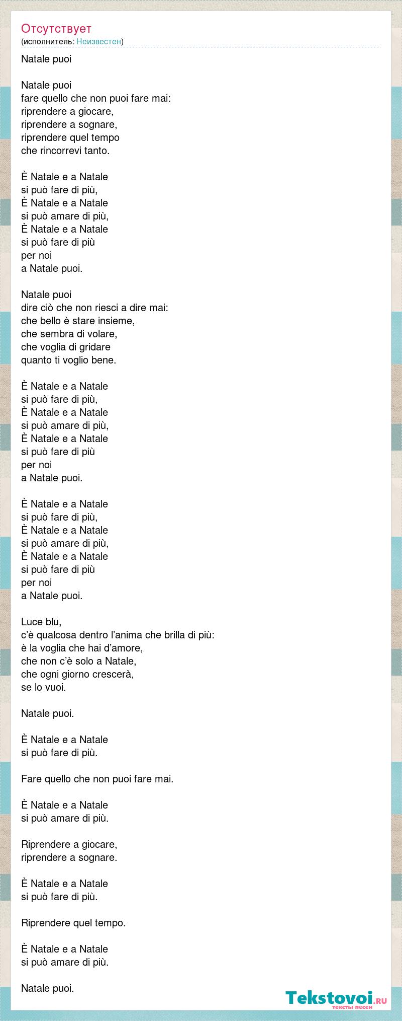 Natale puoi Natale puoi fare quello che non puoi fare mai: riprendere a giocare, riprendere a sognare, riprendere quel tempo che rincorrevi tanto. È Natale e a Natale si può fare di più, È Natale e a Natale si può amare di più, È Natale e a Natale si può fare di più per noi a Natale puoi. Natale puoi dire ciò che non riesci a dire mai: che bello è stare insieme, che sembra di volare, che voglia di gridare quanto ti voglio bene. È Natale e a Natale si può fare di più, È Natale e a Natale si può amare di più, È Natale e a Natale si può fare di più per noi a Natale puoi. È Natale e a Natale si può fare di più, È Natale e a Natale si può amare di più, È Natale e a Natale si può fare di più per noi a Natale puoi. Luce blu, c’è qualcosa dentro l’anima che brilla di più: è la voglia che hai d’amore, che non c’è solo a Natale, che ogni giorno crescerà, se lo vuoi. Natale puoi. È Natale e a Natale si può fare di più. Fare quello che non puoi fare mai. È Natale e a Natale si può amare di più. Riprendere a giocare, riprendere a sognare. È Natale e a Natale si può fare di più. Riprendere quel tempo. È Natale e a Natale si può amare di più. Natale puoi.