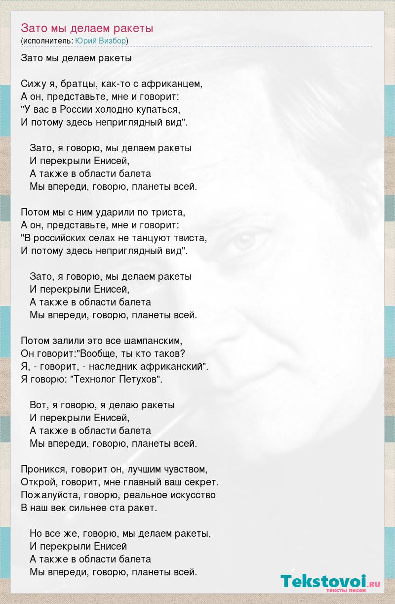 Зато мы делаем ракеты Сижу я, братцы, как-то с африканцем, А он, представьте, мне и говорит: "У вас в России холодно купаться, И потому здесь неприглядный вид". Зато, я говорю, мы делаем ракеты И перекрыли Енисей, А также в области балета Мы впереди, говорю, планеты всей. Потом мы с ним ударили по триста, А он, представьте, мне и говорит: "В российских селах не танцуют твиста, И потому здесь неприглядный вид". Зато, я говорю, мы делаем ракеты И перекрыли Енисей, А также в области балета Мы впереди, говорю, планеты всей. Потом залили это все шампанским, Он говорит:"Вообще, ты кто таков? Я, - говорит, - наследник африканский". Я говорю: "Технолог Петухов". Вот, я говорю, я делаю ракеты И перекрыли Енисей, А также в области балета Мы впереди, говорю, планеты всей. Проникся, говорит он, лучшим чувством, Открой, говорит, мне главный ваш секрет. Пожалуйста, говорю, реальное искусство В наш век сильнее ста ракет. Но все же, говорю, мы делаем ракеты, И перекрыли Енисей А также в области балета Мы впереди, говорю, планеты всей.