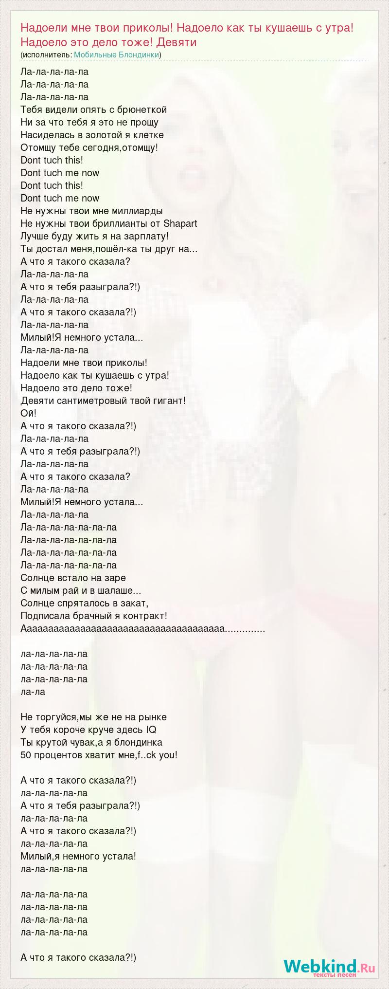Ла-ла-ла-ла-ла Ла-ла-ла-ла-ла Ла-ла-ла-ла-ла Тебя видели опять с брюнеткой Ни за что тебя я это не прощу Насиделась в золотой я клетке Отомщу тебе сегодня,отомщу! Dont tuch this! Dont tuch me now Dont tuch this! Dont tuch me now Не нужны твои мне миллиарды Не нужны твои бриллианты от Shapart Лучше буду жить я на зарплату! Ты достал меня,пошёл-ка ты друг на... А что я такого сказала? Ла-ла-ла-ла-ла А что я тебя разыграла?!) Ла-ла-ла-ла-ла А что я такого сказала?!) Ла-ла-ла-ла-ла Милый!Я немного устала... Ла-ла-ла-ла-ла Надоели мне твои приколы! Надоело как ты кушаешь с утра! Надоело это дело тоже! Девяти сантиметровый твой гигант! Ой! А что я такого сказала?!) Ла-ла-ла-ла-ла А что я тебя разыграла?!) Ла-ла-ла-ла-ла А что я такого сказала? Ла-ла-ла-ла-ла Милый!Я немного устала... Ла-ла-ла-ла-ла Ла-ла-ла-ла-ла-ла-ла Ла-ла-ла-ла-ла-ла-ла Ла-ла-ла-ла-ла-ла-ла Ла-ла-ла-ла-ла-ла-ла Солнце встало на заре С милым рай и в шалаше... Солнце спряталось в закат, Подписала брачный я контракт! Аааааааааааааааааааааааааааааааааааааа.............. ла-ла-ла-ла-ла ла-ла-ла-ла-ла ла-ла-ла-ла-ла ла-ла Не торгуйся,мы же не на рынке У тебя короче круче здесь IQ Ты крутой чувак,а я блондинка 50 процентов хватит мне,f..ck you! А что я такого сказала?!) ла-ла-ла-ла-ла А что я тебя разыграла?!) ла-ла-ла-ла-ла А что я такого сказала?!) ла-ла-ла-ла-ла Милый,я немного устала! ла-ла-ла-ла-ла ла-ла-ла-ла-ла ла-ла-ла-ла-ла ла-ла-ла-ла-ла ла-ла-ла-ла-ла А что я такого сказала?!)