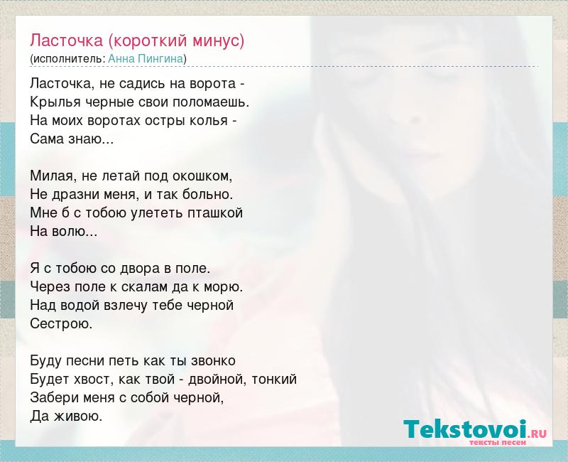 Ласточка, не садись на ворота - Крылья черные свои поломаешь. На моих воротах остры колья - Сама знаю... Милая, не летай под окошком, Не дразни меня, и так больно. Мне б с тобою улететь пташкой На волю... Я с тобою со двора в поле. Через поле к скалам да к морю. Над водой взлечу тебе черной Сестрою. Буду песни петь как ты звонко Будет хвост, как твой - двойной, тонкий Забери меня с собой черной, Да живою.