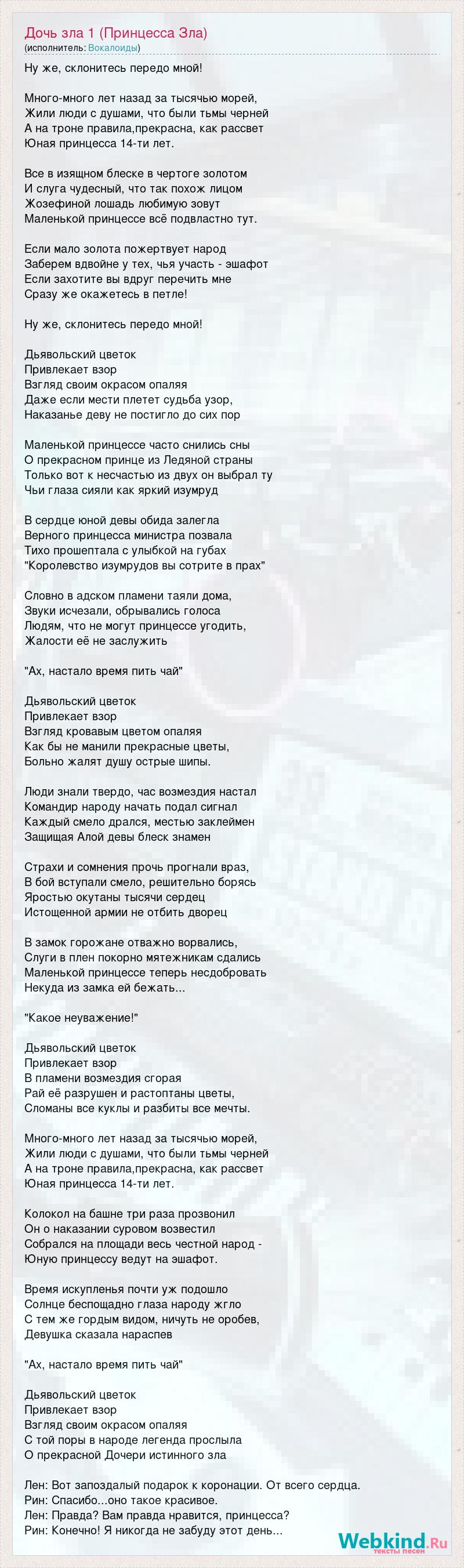 Ну же, склонитесь передо мной! Много-много лет назад за тысячью морей, Жили люди с душами, что были тьмы черней А на троне правила,прекрасна, как рассвет Юная принцесса 14-ти лет. Все в изящном блеске в чертоге золотом И слуга чудесный, что так похож лицом Жозефиной лошадь любимую зовут Маленькой принцессе всё подвластно тут. Если мало золота пожертвует народ Заберем вдвойне у тех, чья участь - эшафот Если захотите вы вдруг перечить мне Сразу же окажетесь в петле! Ну же, склонитесь передо мной! Дьявольский цветок Привлекает взор Взгляд своим окрасом опаляя Даже если мести плетет судьба узор, Наказанье деву не постигло до сих пор Маленькой принцессе часто снились сны О прекрасном принце из Ледяной страны Только вот к несчастью из двух он выбрал ту Чьи глаза сияли как яркий изумруд В сердце юной девы обида залегла Верного принцесса министра позвала Тихо прошептала с улыбкой на губах "Королевство изумрудов вы сотрите в прах" Словно в адском пламени таяли дома, Звуки исчезали, обрывались голоса Людям, что не могут принцессе угодить, Жалости её не заслужить "Ах, настало время пить чай" Дьявольский цветок Привлекает взор Взгляд кровавым цветом опаляя Как бы не манили прекрасные цветы, Больно жалят душу острые шипы. Люди знали твердо, час возмездия настал Командир народу начать подал сигнал Каждый смело дрался, местью заклеймен Защищая Алой девы блеск знамен Страхи и сомнения прочь прогнали враз, В бой вступали смело, решительно борясь Яростью окутаны тысячи сердец Истощенной армии не отбить дворец В замок горожане отважно ворвались, Слуги в плен покорно мятежникам сдались Маленькой принцессе теперь несдобровать Некуда из замка ей бежать... "Какое неуважение!" Дьявольский цветок Привлекает взор В пламени возмездия сгорая Рай её разрушен и растоптаны цветы, Сломаны все куклы и разбиты все мечты. Много-много лет назад за тысячью морей, Жили люди с душами, что были тьмы черней А на троне правила,прекрасна, как рассвет Юная принцесса 14-ти лет. Колокол на башне три раза прозвонил Он о наказании суровом возвестил Собрался на площади весь честной народ - Юную принцессу ведут на эшафот. Время искупленья почти уж подошло Солнце беспощадно глаза народу жгло С тем же гордым видом, ничуть не оробев, Девушка сказала нараспев "Ах, настало время пить чай" Дьявольский цветок Привлекает взор Взгляд своим окрасом опаляя С той поры в народе легенда прослыла О прекрасной Дочери истинного зла Лен: Вот запоздалый подарок к коронации. От всего сердца. Рин: Спасибо...оно такое красивое. Лен: Правда? Вам правда нравится, принцесса? Рин: Конечно! Я никогда не забуду этот день...