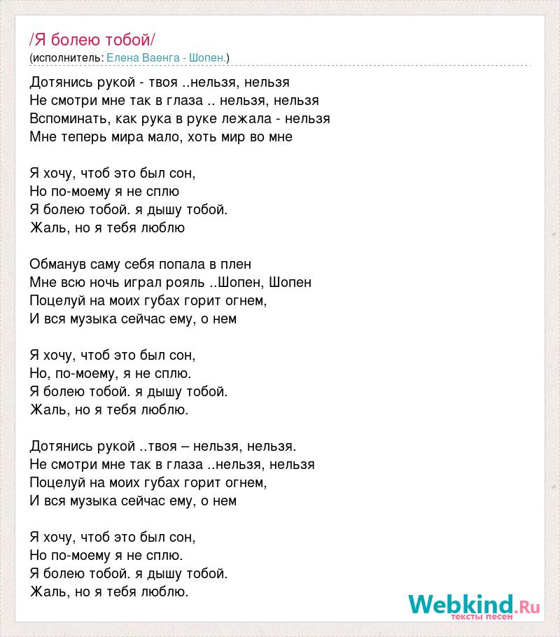 Дотянись рукой - твоя ..нельзя, нельзя Не смотри мне так в глаза .. нельзя, нельзя Вспоминать, как рука в руке лежала - нельзя Мне теперь мира мало, хоть мир во мне Я хочу, чтоб это был сон, Но по-моему я не сплю Я болею тобой. я дышу тобой. Жаль, но я тебя люблю Обманув саму себя попала в плен Мне всю ночь играл рояль ..Шопен, Шопен Поцелуй на моих губах горит огнем, И вся музыка сейчас ему, о нем Я хочу, чтоб это был сон, Но, по-моему, я не сплю. Я болею тобой. я дышу тобой. Жаль, но я тебя люблю. Дотянись рукой ..твоя – нельзя, нельзя. Не смотри мне так в глаза ..нельзя, нельзя Поцелуй на моих губах горит огнем, И вся музыка сейчас ему, о нем Я хочу, чтоб это был сон, Но по-моему я не сплю. Я болею тобой. я дышу тобой. Жаль, но я тебя люблю.