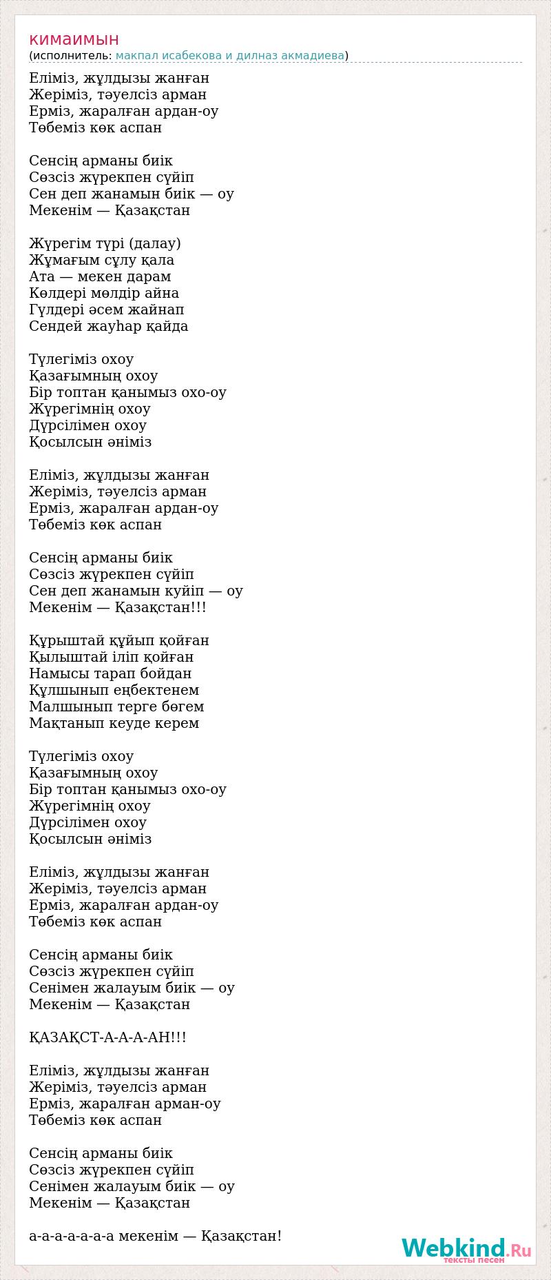 Еліміз, жұлдызы жанған Жеріміз, тәуелсіз арман Ерміз, жаралған ардан-оу Төбеміз көк аспан Сенсің арманы биік Сөзсіз жүрекпен сүйіп Сен деп жанамын биік — оу Мекенім — Қазақстан Жүрегім түрі (далау) Жұмағым сұлу қала Ата — мекен дарам Көлдері мөлдір айна Гүлдері әсем жайнап Сендей жауһар қайда Түлегіміз охоу Қазағымның охоу Бір топтан қанымыз охо-оу Жүрегімнің охоу Дүрсілімен охоу Қосылсын әніміз Еліміз, жұлдызы жанған Жеріміз, тәуелсіз арман Ерміз, жаралған ардан-оу Төбеміз көк аспан Сенсің арманы биік Сөзсіз жүрекпен сүйіп Сен деп жанамын куйiп — оу Мекенім — Қазақстан!!! Құрыштай құйып қойған Қылыштай іліп қойған Намысы тарап бойдан Құлшынып еңбектенем Малшынып терге бөгем Мақтанып кеуде керем Түлегіміз охоу Қазағымның охоу Бір топтан қанымыз охо-оу Жүрегімнің охоу Дүрсілімен охоу Қосылсын әніміз Еліміз, жұлдызы жанған Жеріміз, тәуелсіз арман Ерміз, жаралған ардан-оу Төбеміз көк аспан Сенсің арманы биік Сөзсіз жүрекпен сүйіп Сенімен жалауым биік — оу Мекенім — Қазақстан ҚАЗАҚСТ-A-A-A-АН!!! Еліміз, жұлдызы жанған Жеріміз, тәуелсіз арман Ерміз, жаралған арман-оу Төбеміз көк аспан Сенсің арманы биік Сөзсіз жүрекпен сүйіп Сенімен жалауым биік — оу Мекенім — Қазақстан a-a-a-a-a-a-a мекенім — Қазақстан!