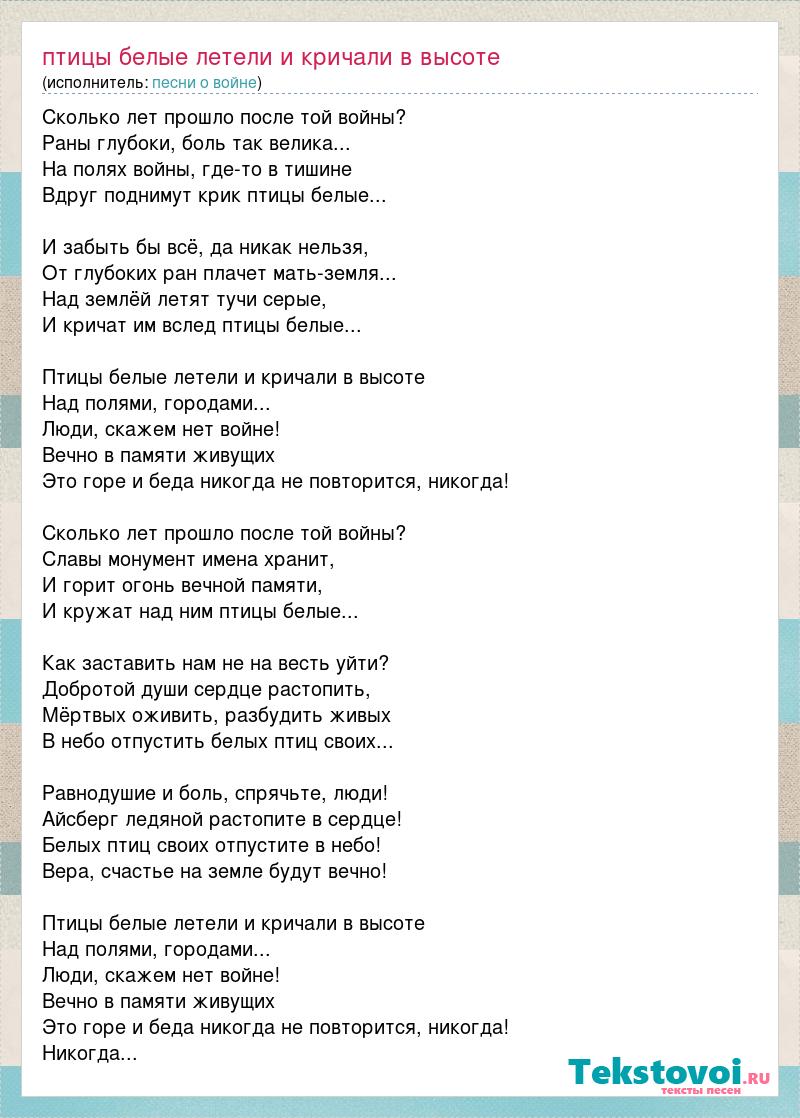 Сколько лет прошло после той войны? Раны глубоки, боль так велика... На полях войны, где-то в тишине Вдруг поднимут крик птицы белые... И забыть бы всё, да никак нельзя, От глубоких ран плачет мать-земля... Над землёй летят тучи серые, И кричат им вслед птицы белые... Птицы белые летели и кричали в высоте Над полями, городами... Люди, скажем нет войне! Вечно в памяти живущих Это горе и беда никогда не повторится, никогда! Сколько лет прошло после той войны? Славы монумент имена хранит, И горит огонь вечной памяти, И кружат над ним птицы белые... Как заставить нам не на весть уйти? Добротой души сердце растопить, Мёртвых оживить, разбудить живых В небо отпустить белых птиц своих... Равнодушие и боль, спрячьте, люди! Айсберг ледяной растопите в сердце! Белых птиц своих отпустите в небо! Вера, счастье на земле будут вечно! Птицы белые летели и кричали в высоте Над полями, городами... Люди, скажем нет войне! Вечно в памяти живущих Это горе и беда никогда не повторится, никогда! Никогда...