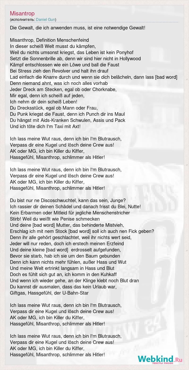 Die Gewalt, die ich anwenden muss, ist eine notwendige Gewalt! Misanthrop, Definition Menschenfeind In dieser scheiß Welt musst du kämpfen, Weil du nichts umsonst kriegst, das Leben ist kein Ponyhof Setzt die Sonnenbrille ab, denn wir sind hier nicht in Hollywood Kämpf entschlossen wie ein Löwe und ball die Faust Bei Stress zieh den Revolver und halt ihn drauf Lad einfach die Knarre durch und wenn sie dich belächeln, dann lass [bad word] Denn niemand ahnt, was ich noch alles vorhab Jeder Dreck am Stecken, egal ob oder Chorknabe, Mir egal, denn ich scheiß auf jeden, Ich nehm dir dein scheiß Leben! Du Drecksstück, egal ob Mann oder Frau, Du Punk kriegst die Faust, denn ich Punch dir ins Maul Du hängst mit Aids-Kranken Schwulen, Assis und Pack Und ich töte dich I'm Taxi mit Axt! Ich lass meine Wut raus, denn ich bin I'm Blutrausch, Verpass dir eine Kugel und lösch deine Crew aus! AK oder MG, ich bin Killer du Kiffer, Hassgefühl, Misanthrop, schlimmer als Hitler! Ich lass meine Wut raus, denn ich bin I'm Blutrausch, Verpass dir eine Kugel und lösch deine Crew aus! AK oder MG, ich bin Killer du Kiffer, Hassgefühl, Misanthrop, schlimmer als Hitler! Du bist nur ne Discoschwuchtel, kann das sein, Junge? Ich rassier dir deinen Schädel und danach frisst du Blei, Nutte! Kein Erbarmen oder Mitleid für jegliche Menschenstricher Stirb! Weil du weißt wie Penise schmecken Und deine [bad word] Mutter, das behinderte Mistvieh, Erschlag ich mit nem Stock [bad word] soll ich auch nen Fick geben? Denn ihr alle gehört geschlachtet, weil ihr nichts wert seid, Jeder will nur reden, doch ich erstech meinen Erzfeind Und deine kleine [bad word] erdrosselt aufgefunden, Bevor sie starb, hab ich sie um den Baum gebunden Denn ich kann nichts mehr fühlen, außer Hass und Wut Und meine Welt ertrinkt langsam in Hass und Blut Doch es fühlt sich gut an, ich komm in den Kuhkaff Und wenn ich wieder gehe, an der Klinge klebt noch Blut dran Du kannst dir ausmalen, dass das kein Urlaub war, Giftgas, Hassgefühl, der U-Bahn-Star Ich lass meine Wut raus, denn ich bin I'm Blutrausch, Verpass dir eine Kugel und lösch deine Crew aus! AK oder MG, ich bin Killer du Kiffer, Hassgefühl, Misanthrop, schlimmer als Hitler! Ich lass meine Wut raus, denn ich bin I'm Blutrausch, Verpass dir eine Kugel und lösch deine Crew aus! AK oder MG, ich bin Killer du Kiffer, Hassgefühl, Misanthrop, schlimmer als Hitler!