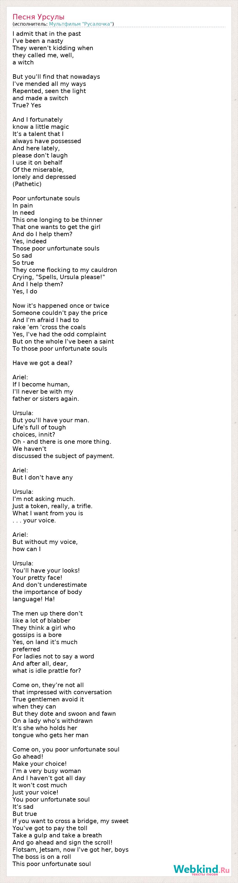 I admit that in the past I've been a nasty They weren't kidding when they called me, well, a witch But you'll find that nowadays I've mended all my ways Repented, seen the light and made a switch True? Yes And I fortunately know a little magic It's a talent that I always have possessed And here lately, please don't laugh I use it on behalf Of the miserable, lonely and depressed (Pathetic) Poor unfortunate souls In pain In need This one longing to be thinner That one wants to get the girl And do I help them? Yes, indeed Those poor unfortunate souls So sad So true They come flocking to my cauldron Crying, "Spells, Ursula please!" And I help them? Yes, I do Now it's happened once or twice Someone couldn't pay the price And I'm afraid I had to rake 'em 'cross the coals Yes, I've had the odd complaint But on the whole I've been a saint To those poor unfortunate souls Have we got a deal? Ariel: If I become human, I'll never be with my father or sisters again. Ursula: But you'll have your man. Life's full of tough choices, innit? Oh - and there is one more thing. We haven't discussed the subject of payment. Ariel: But I don't have any Ursula: I'm not asking much. Just a token, really, a trifle. What I want from you is . . . your voice. Ariel: But without my voice, how can I Ursula: You'll have your looks! Your pretty face! And don't underestimate the importance of body language! Ha! The men up there don't like a lot of blabber They think a girl who gossips is a bore Yes, on land it's much preferred For ladies not to say a word And after all, dear, what is idle prattle for? Come on, they're not all that impressed with conversation True gentlemen avoid it when they can But they dote and swoon and fawn On a lady who's withdrawn It's she who holds her tongue who gets her man Come on, you poor unfortunate soul Go ahead! Make your choice! I'm a very busy woman And I haven't got all day It won't cost much Just your voice! You poor unfortunate soul It's sad But true If you want to cross a bridge, my sweet You've got to pay the toll Take a gulp and take a breath And go ahead and sign the scroll! Flotsam, Jetsam, now I've got her, boys The boss is on a roll This poor unfortunate soul