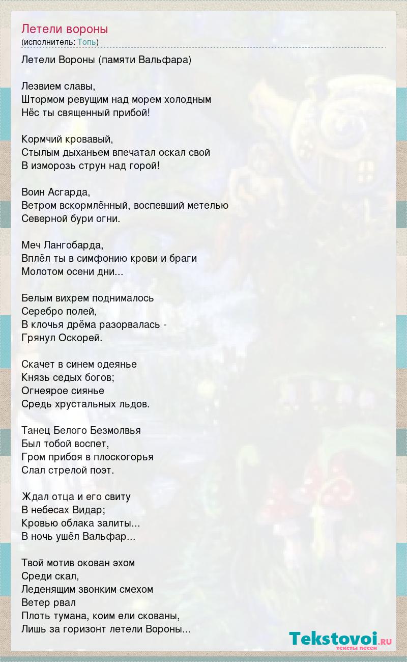 Летели Вороны (памяти Вальфара) Лезвием славы, Штормом ревущим над морем холодным Нёс ты священный прибой! Кормчий кровавый, Стылым дыханьем впечатал оскал свой В изморозь струн над горой! Воин Асгарда, Ветром вскормлённый, воспевший метелью Северной бури огни. Меч Лангобарда, Вплёл ты в симфонию крови и браги Молотом осени дни... Белым вихрем поднималось Серебро полей, В клочья дрёма разорвалась - Грянул Оскорей. Скачет в синем одеянье Князь седых богов; Огнеярое сиянье Средь хрустальных льдов. Танец Белого Безмолвья Был тобой воспет, Гром прибоя в плоскогорья Слал стрелой поэт. Ждал отца и его свиту В небесах Видар; Кровью облака залиты... В ночь ушёл Вальфар... Твой мотив окован эхом Среди скал, Леденящим звонким смехом Ветер рвал Плоть тумана, коим ели скованы, Лишь за горизонт летели Вороны...