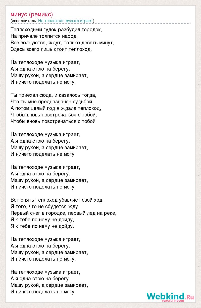 Теплоходный гудок разбудил городок, На причале толпится народ, Все волнуются, ждут, только десять минут, Здесь всего лишь стоит теплоход. На теплоходе музыка играет, А я одна стою на берегу. Машу рукой, а сердце замирает, И ничего поделать не могу. Ты приехал сюда, и казалось тогда, Что ты мне предназначен судьбой, А потом целый год я ждала теплоход, Чтобы вновь повстречаться с тобой, Чтобы вновь повстречаться с тобой На теплоходе музыка играет, А я одна стою на берегу. Машу рукой, а сердце замирает, И ничего поделать не могу На теплоходе музыка играет, А я одна стою на берегу. Машу рукой, а сердце замирает, И ничего поделать не могу. Вот опять теплоход убавляет свой ход. Я того, что не сбудется жду. Первый снег в городке, первый лед на реке, Я к тебе по нему не дойду, Я к тебе по нему не дойду. На теплоходе музыка играет, А я одна стою на берегу. Машу рукой, а сердце замирает, И ничего поделать не могу. На теплоходе музыка играет, А я одна стою на берегу. Машу рукой, а сердце замирает, И ничего поделать не могу.