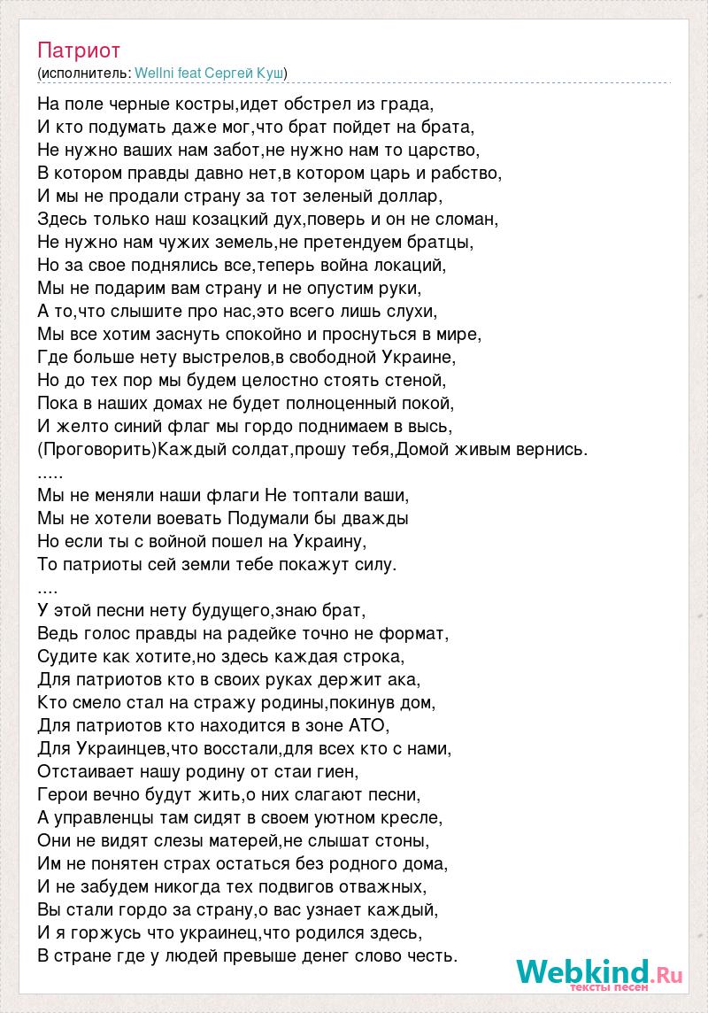 На поле черные костры,идет обстрел из града, И кто подумать даже мог,что брат пойдет на брата, Не нужно ваших нам забот,не нужно нам то царство, В котором правды давно нет,в котором царь и рабство, И мы не продали страну за тот зеленый доллар, Здесь только наш козацкий дух,поверь и он не сломан, Не нужно нам чужих земель,не претендуем братцы, Но за свое поднялись все,теперь война локаций, Мы не подарим вам страну и не опустим руки, А то,что слышите про нас,это всего лишь слухи, Мы все хотим заснуть спокойно и проснуться в мире, Где больше нету выстрелов,в свободной Украине, Но до тех пор мы будем целостно стоять стеной, Пока в наших домах не будет полноценный покой, И желто синий флаг мы гордо поднимаем в высь, (Проговорить)Каждый солдат,прошу тебя,Домой живым вернись. ..... Мы не меняли наши флаги Не топтали ваши, Мы не хотели воевать Подумали бы дважды Но если ты с войной пошел на Украину, То патриоты сей земли тебе покажут силу. .... У этой песни нету будущего,знаю брат, Ведь голос правды на радейке точно не формат, Судите как хотите,но здесь каждая строка, Для патриотов кто в своих руках держит ака, Кто смело стал на стражу родины,покинув дом, Для патриотов кто находится в зоне АТО, Для Украинцев,что восстали,для всех кто с нами, Отстаивает нашу родину от стаи гиен, Герои вечно будут жить,о них слагают песни, А управленцы там сидят в своем уютном кресле, Они не видят слезы матерей,не слышат стоны, Им не понятен страх остаться без родного дома, И не забудем никогда тех подвигов отважных, Вы стали гордо за страну,о вас узнает каждый, И я горжусь что украинец,что родился здесь, В стране где у людей превыше денег слово честь.