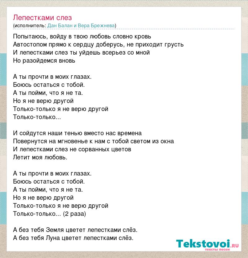 Попытаюсь, войду в твою любовь словно кровь Автостопом прямо к сердцу доберусь, не приходит грусть И лепестками слез ты уйдешь всерьез со мной Но разойдемся вновь А ты прочти в моих глазах. Боюсь остаться с тобой. А ты пойми, что я не та. Но я не верю другой Только-только я не верю другой Только-только... И сойдутся наши тенью вместо нас времена Повернутся на мгновенье к нам с тобой светом из окна И лепестками слез не сорванных цветов Летит моя любовь. А ты прочти в моих глазах. Боюсь остаться с тобой. А ты пойми, что я не та. Но я не верю другой Только-только я не верю другой Только-только... (2 раза) А без тебя Земля цветет лепестками слёз. А без тебя Луна цветет лепестками слёз.