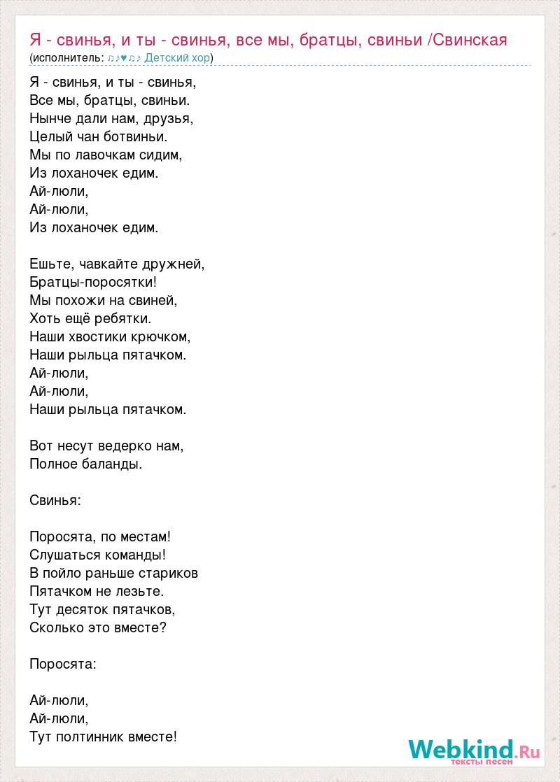 Я - свинья, и ты - свинья, Все мы, братцы, свиньи. Нынче дали нам, друзья, Целый чан ботвиньи. Мы по лавочкам сидим, Из лоханочек едим. Ай-люли, Ай-люли, Из лоханочек едим. Ешьте, чавкайте дружней, Братцы-поросятки! Мы похожи на свиней, Хоть ещё ребятки. Наши хвостики крючком, Наши рыльца пятачком. Ай-люли, Ай-люли, Наши рыльца пятачком. Вот несут ведерко нам, Полное баланды. Свинья: Поросята, по местам! Слушаться команды! В пойло раньше стариков Пятачком не лезьте. Тут десяток пятачков, Сколько это вместе? Поросята: Ай-люли, Ай-люли, Тут полтинник вместе!