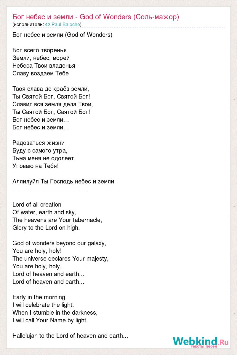 Бог небес и земли (God of Wonders) Бог всего творенья Земли, небес, морей Небеса Твои владенья Славу воздаем Тебе Твоя слава до краёв земли, Ты Святой Бог, Святой Бог! Славит вся земля дела Твои, Ты Святой Бог, Святой Бог! Бог небес и земли… Бог небес и земли… Радоваться жизни Буду с самого утра, Тьма меня не одолеет, Уповаю на Тебя! Аллилуйя Ты Господь небес и земли _______________________ Lord of all creation Of water, earth and sky, The heavens are Your tabernacle, Glory to the Lord on high. God of wonders beyond our galaxy, You are holy, holy! The universe declares Your majesty, You are holy, holy, Lord of heaven and earth... Lord of heaven and earth... Early in the morning, I will celebrate the light. When I stumble in the darkness, I will call Your Name by light. Hallelujah to the Lord of heaven and earth...
