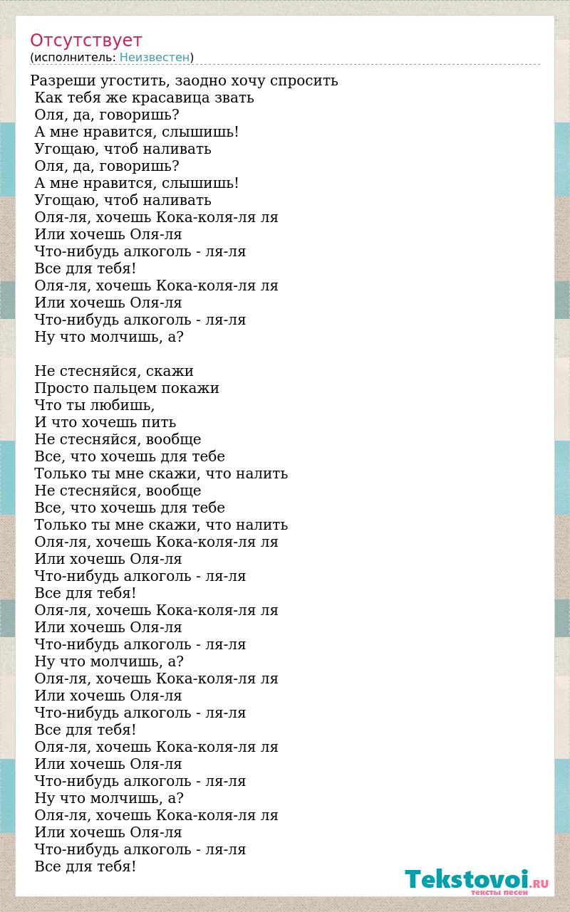 Разреши угостить, заодно хочу спросить Как тебя же красавица звать Оля, да, говоришь? А мне нравится, слышишь! Угощаю, чтоб наливать Оля, да, говоришь? А мне нравится, слышишь! Угощаю, чтоб наливать Оля-ля, хочешь Кока-коля-ля ля Или хочешь Оля-ля Что-нибудь алкоголь - ля-ля Все для тебя! Оля-ля, хочешь Кока-коля-ля ля Или хочешь Оля-ля Что-нибудь алкоголь - ля-ля Ну что молчишь, а? Не стесняйся, скажи Просто пальцем покажи Что ты любишь, И что хочешь пить Не стесняйся, вообще Все, что хочешь для тебе Только ты мне скажи, что налить Не стесняйся, вообще Все, что хочешь для тебе Только ты мне скажи, что налить Оля-ля, хочешь Кока-коля-ля ля Или хочешь Оля-ля Что-нибудь алкоголь - ля-ля Все для тебя! Оля-ля, хочешь Кока-коля-ля ля Или хочешь Оля-ля Что-нибудь алкоголь - ля-ля Ну что молчишь, а? Оля-ля, хочешь Кока-коля-ля ля Или хочешь Оля-ля Что-нибудь алкоголь - ля-ля Все для тебя! Оля-ля, хочешь Кока-коля-ля ля Или хочешь Оля-ля Что-нибудь алкоголь - ля-ля Ну что молчишь, а? Оля-ля, хочешь Кока-коля-ля ля Или хочешь Оля-ля Что-нибудь алкоголь - ля-ля Все для тебя!