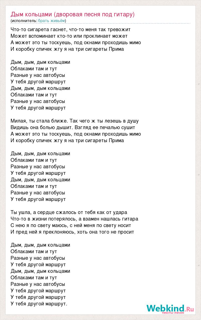 Что-то сигарета гаснет, что-то меня так тревожит Может вспоминает кто-то или проклинает может А может это ты тоскуешь, под окнами проходишь мимо И коробку спичек жгу я на три сигареты Прима Дым, дым, дым кольцами Облаками там и тут Разные у нас автобусы У тебя другой маршрут Дым, дым, дым кольцами Облаками там и тут Разные у нас автобусы У тебя другой маршрут Милая, ты стала ближе. Так чего ж ты лезешь в душу Видишь она болью дышит. Взгляд ее печалью сушит А может это ты тоскуешь, под окнами проходишь мимо И коробку спичек жгу я на три сигареты Прима Дым, дым, дым кольцами Облаками там и тут Разные у нас автобусы У тебя другой маршрут Дым, дым, дым кольцами Облаками там и тут Разные у нас автобусы У тебя другой маршрут Ты ушла, а сердце сжалось от тебя как от удара Что-то в жизни потерялось, а взамен нашлась гитара С нею я по свету маюсь, с ней меня по свету носит И пред ней я преклоняюсь, хоть она того не просит Дым, дым, дым кольцами Облаками там и тут Разные у нас автобусы У тебя другой маршрут Дым, дым, дым кольцами Облаками там и тут Разные у нас автобусы У тебя другой маршрут У тебя другой маршрут У тебя другой маршрут.
