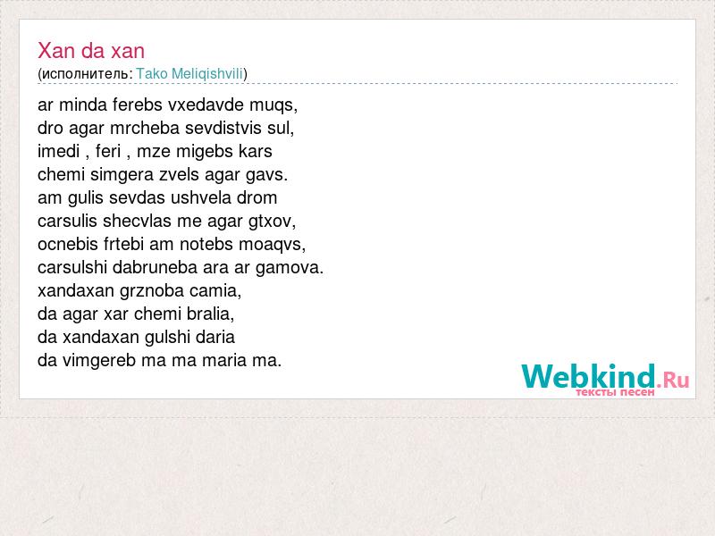ar minda ferebs vxedavde muqs, dro agar mrcheba sevdistvis sul, imedi , feri , mze migebs kars chemi simgera zvels agar gavs. am gulis sevdas ushvela drom carsulis shecvlas me agar gtxov, ocnebis frtebi am notebs moaqvs, carsulshi dabruneba ara ar gamova. xandaxan grznoba camia, da agar xar chemi bralia, da xandaxan gulshi daria da vimgereb ma ma maria ma.