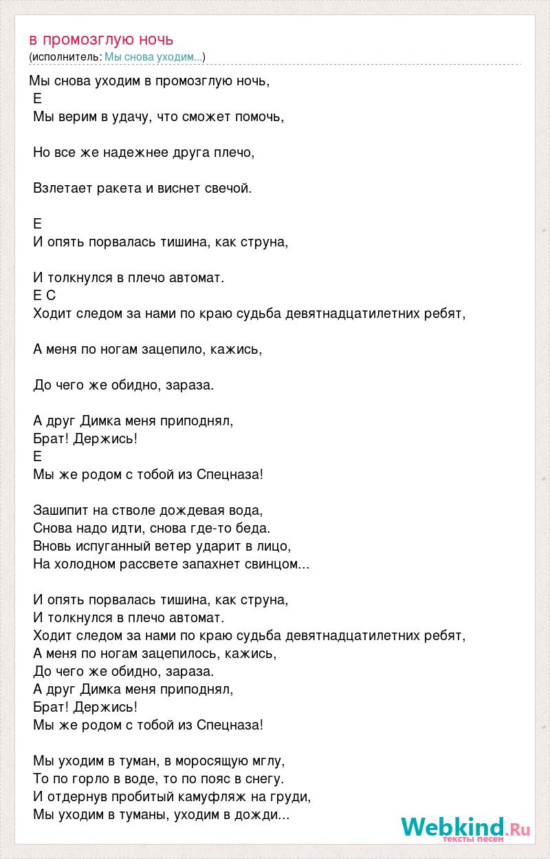 Мы снова уходим в промозглую ночь, Е Мы верим в удачу, что сможет помочь, Но все же надежнее друга плечо, Взлетает ракета и виснет свечой. Е И опять порвалась тишина, как струна, И толкнулся в плечо автомат. Е С Ходит следом за нами по краю судьба девятнадцатилетних ребят, А меня по ногам зацепило, кажись, До чего же обидно, зараза. А друг Димка меня приподнял, Брат! Держись! Е Мы же родом с тобой из Спецназа! Зашипит на стволе дождевая вода, Снова надо идти, снова где-то беда. Вновь испуганный ветер ударит в лицо, На холодном рассвете запахнет свинцом... И опять порвалась тишина, как струна, И толкнулся в плечо автомат. Ходит следом за нами по краю судьба девятнадцатилетних ребят, А меня по ногам зацепилось, кажись, До чего же обидно, зараза. А друг Димка меня приподнял, Брат! Держись! Мы же родом с тобой из Спецназа! Мы уходим в туман, в моросящую мглу, То по горло в воде, то по пояс в снегу. И отдернув пробитый камуфляж на груди, Мы уходим в туманы, уходим в дожди...