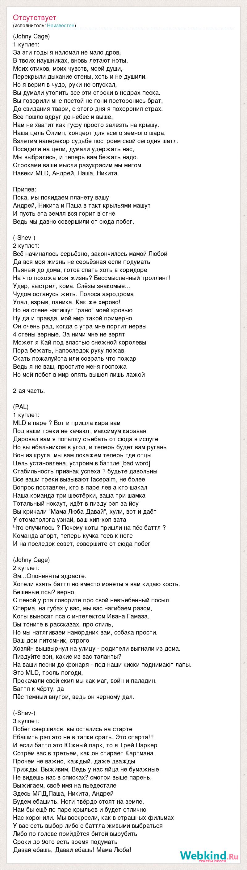(Johny Cage) 1 куплет: За эти годы я наломал не мало дров, В твоих наушниках, вновь летают ноты. Моих стихов, моих чувств, моей души, Перекрыли дыхание стены, хоть и не душили. Но я верил в чудо, руки не опускал, Вы думали утопить все эти строки в недрах песка. Вы говорили мне постой не гони посторонись брат, До свидания твари, с этого дня я похоронил страх. Все пошло вдруг до небес и выше, Нам не хватит как гуфу просто залезть на крышу. Наша цель Олимп, концерт для всего земного шара, Взлетим наперекор судьбе построем свой сегодня шатл. Посадили на цепи, думали удержать нас, Мы выбрались, и теперь вам бежать надо. Строками ваши мысли разукрасим мы мигом. Навеки MLD, Андрей, Паша, Никита. Припев: Пока, мы покидаем планету вашу Андрей, Никита и Паша в такт крыльями машут И пусть эта земля вся горит в огне Ведь мы давно совершили от сюда побег. (-Shev-) 2 куплет: Всё начиналось серьёзно, закончилось мамой Любой Да вся моя жизнь не серьёзная если подумать Пьяный до дома, готов спать хоть в коридоре На что похожа моя жизнь? Бессмысленный троллинг! Удар, выстрел, кома. Слёзы знакомые... Чудом останусь жить. Полоса аэродрома Упал, взрыв, паника. Как же херово! Но на стене напишут "рано" моей кровью Ну да и правда, мой мир такой примерно Он очень рад, когда с утра мне портит нервы 4 стены верные. За ними мне не верят Может я Кай под властью снежной королевы Пора бежать, напоследок руку пожав Скать пожалуйста или соврать что пожар Ведь я не ваш, простите меня госпожа Но мой побег в мир опять вышел лишь лажой 2-ая часть. (PAL) 1 куплет: MLD в паре ? Вот и пришла кара вам Под ваши треки не качают, максимум караван Даровал вам я попытку съебать от сюда в испуге Но вы ебальником в угол, и теперь будет вам ругань Вон из круга, мы вам покажем теперь где отцы Цель установлена, устроим в баттле [bad word] Стабильность признак успеха ? будьте давольны Все ваши треки вызывают facepalm, не более Вопрос поставлен, кто в паре лев а кто шакал Наша команда три шестёрки, ваша три шамка Тотальный нокаут, идёт в пизду рэп за йоу Вы кричали "Мама Люба Давай", хули, вот и даёт У стоматолога узнай, ваш хип-хоп вата Что случилось ? Почему коты пришли на пёс баттл ? Команда апорт, теперь кучка геев к ноге И на последок совет, совершите от сюда побег (Johny Cage) 2 куплет: Эм...Опоненнты здрасте. Хотели взять баттл но вместо монеты я вам кидаю кость. Бешеные псы? верно, С пеной у рта говорите про свой невъебенный посыл. Сперма, на губах у вас, мы вас нагибаем разом, Коты выносят пса с интелектом Ивана Гамаза. Вы тоните в рассказах, про стиль, Но мы натягиваем намордник вам, собака прости. Ваш дом питомник, строго Хозяйн вышвырнул на улицу - родители выгнали из дома. Пиздуйте вон, какие из вас таланты? На ваши песни до фонаря - под наши киски поднимают лапы. Это MLD, троль погоди, Прокачали свой скил мы как маг, войн и паладин. Баттл к чёрту, да Пёс темный внутри, ведь он черному дал. (-Shev-) 3 кулпет: Побег свершился. вы остались на старте Ебашить рэп это не в тапки срать. Это спарта!!! И если баттл это Южный парк, то я Трей Паркер Сотрём вас в третьем, как он стирает Картмана Прочем не важно, каждый. даже дважды Трижды. Выживим, Ведь у нас яйца не бумажные Не видешь нас в списках? смотри выше парень. Выжигаем, своё имя на пьедестале Здесь МЛД,Паша, Никита, Андрей Будем ебашить. Ноги твёрдо стоят на земле. Нам бы ещё по паре крыльев и будет отлично Нас хоронили. Мы вос