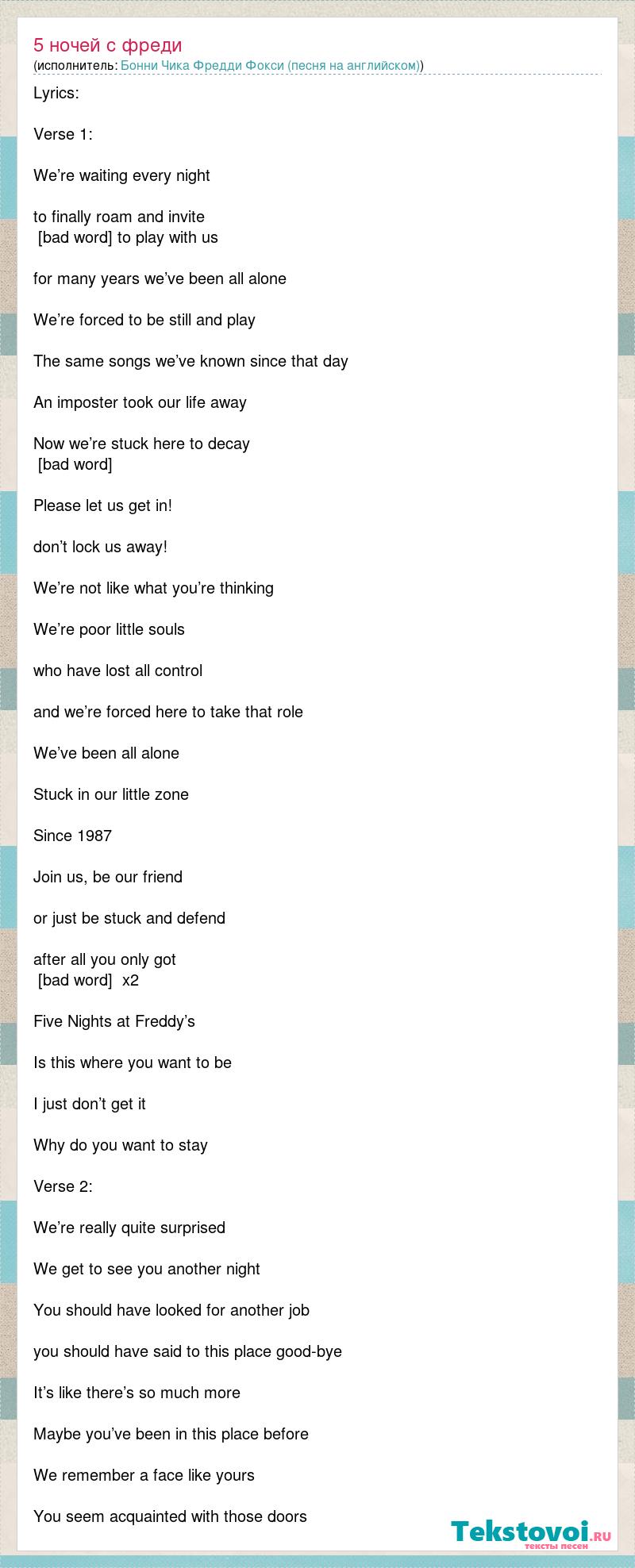 Lyrics: Verse 1: We’re waiting every night to finally roam and invite newcomers to play with us for many years we’ve been all alone We’re forced to be still and play The same songs we’ve known since that day An imposter took our life away Now we’re stuck here to decay Pre-Chorus: Please let us get in! don’t lock us away! We’re not like what you’re thinking We’re poor little souls who have lost all control and we’re forced here to take that role We’ve been all alone Stuck in our little zone Since 1987 Join us, be our friend or just be stuck and defend after all you only got Chorus: x2 Five Nights at Freddy’s Is this where you want to be I just don’t get it Why do you want to stay Verse 2: We’re really quite surprised We get to see you another night You should have looked for another job you should have said to this place good-bye It’s like there’s so much more Maybe you’ve been in this place before We remember a face like yours You seem acquainted with those doors