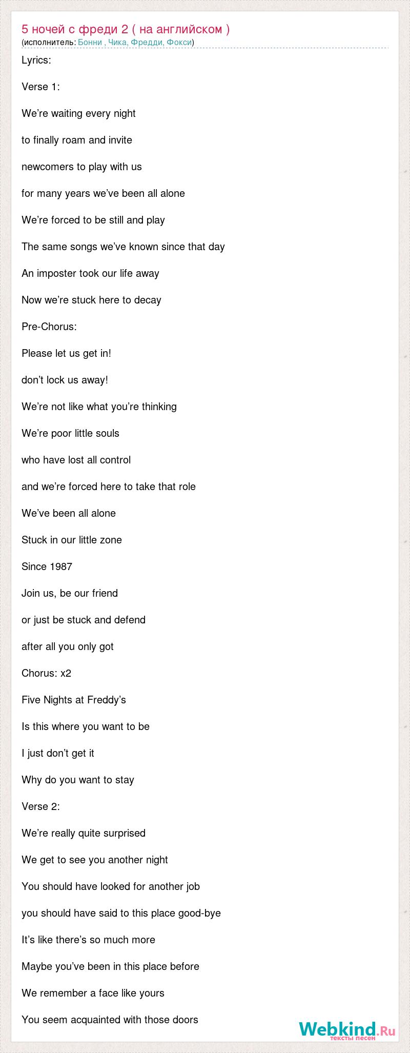 Lyrics: Verse 1: We’re waiting every night to finally roam and invite newcomers to play with us for many years we’ve been all alone We’re forced to be still and play The same songs we’ve known since that day An imposter took our life away Now we’re stuck here to decay Pre-Chorus: Please let us get in! don’t lock us away! We’re not like what you’re thinking We’re poor little souls who have lost all control and we’re forced here to take that role We’ve been all alone Stuck in our little zone Since 1987 Join us, be our friend or just be stuck and defend after all you only got Chorus: x2 Five Nights at Freddy’s Is this where you want to be I just don’t get it Why do you want to stay Verse 2: We’re really quite surprised We get to see you another night You should have looked for another job you should have said to this place good-bye It’s like there’s so much more Maybe you’ve been in this place before We remember a face like yours You seem acquainted with those doors