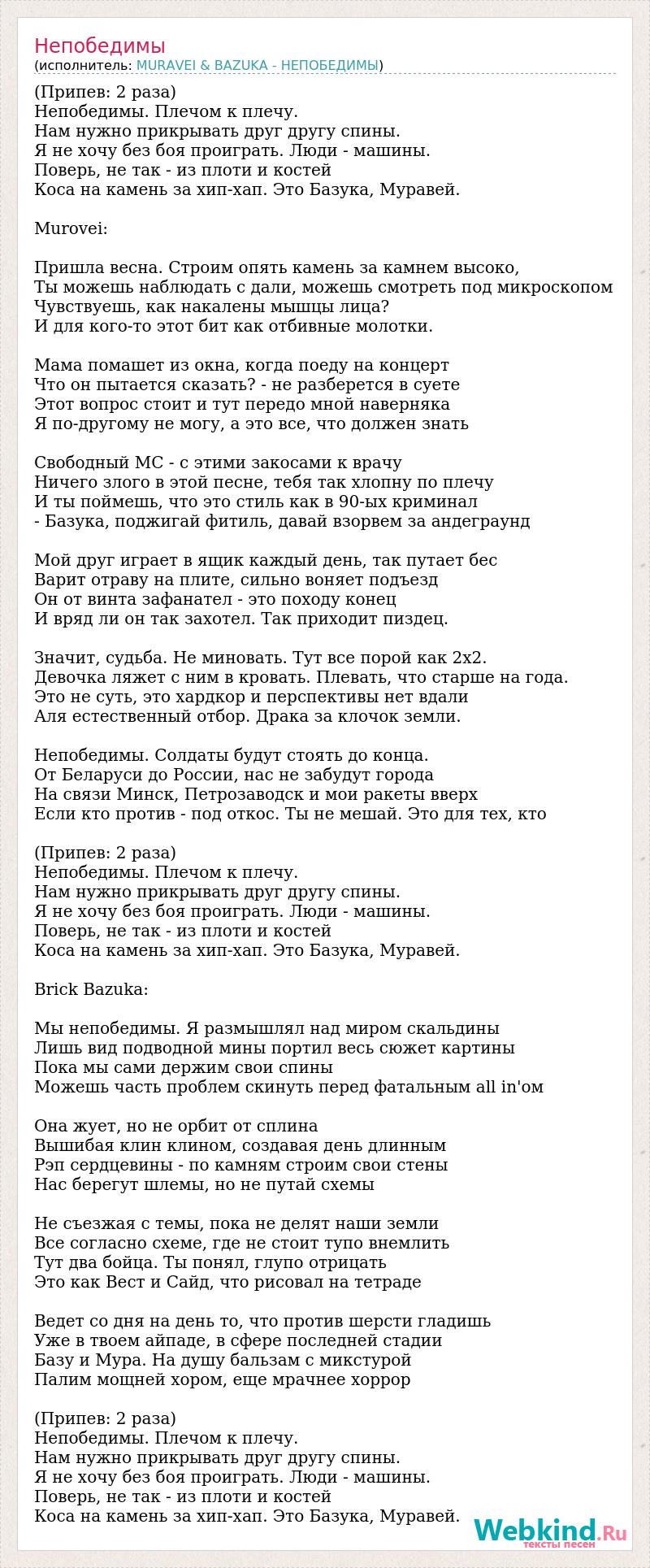 (Припев: 2 раза) Непобедимы. Плечом к плечу. Нам нужно прикрывать друг другу спины. Я не хочу без боя проиграть. Люди - машины. Поверь, не так - из плоти и костей Коса на камень за хип-хап. Это Базука, Муравей. Murovei: Пришла весна. Строим опять камень за камнем высоко, Ты можешь наблюдать с дали, можешь смотреть под микроскопом Чувствуешь, как накалены мышцы лица? И для кого-то этот бит как отбивные молотки. Мама помашет из окна, когда поеду на концерт Что он пытается сказать? - не разберется в суете Этот вопрос стоит и тут передо мной наверняка Я по-другому не могу, а это все, что должен знать Свободный МС - с этими закосами к врачу Ничего злого в этой песне, тебя так хлопну по плечу И ты поймешь, что это стиль как в 90-ых криминал - Базука, поджигай фитиль, давай взорвем за андеграунд Мой друг играет в ящик каждый день, так путает бес Варит отраву на плите, сильно воняет подъезд Он от винта зафанател - это походу конец И вряд ли он так захотел. Так приходит пиздец. Значит, судьба. Не миновать. Тут все порой как 2x2. Девочка ляжет с ним в кровать. Плевать, что старше на года. Это не суть, это хардкор и перспективы нет вдали Аля естественный отбор. Драка за клочок земли. Непобедимы. Солдаты будут стоять до конца. От Беларуси до России, нас не забудут города На связи Минск, Петрозаводск и мои ракеты вверх Если кто против - под откос. Ты не мешай. Это для тех, кто (Припев: 2 раза) Непобедимы. Плечом к плечу. Нам нужно прикрывать друг другу спины. Я не хочу без боя проиграть. Люди - машины. Поверь, не так - из плоти и костей Коса на камень за хип-хап. Это Базука, Муравей. Brick Bazuka: Мы непобедимы. Я размышлял над миром скальдины Лишь вид подводной мины портил весь сюжет картины Пока мы сами держим свои спины Можешь часть проблем скинуть перед фатальным all in'ом Она жует, но не орбит от сплина Вышибая клин клином, создавая день длинным Рэп сердцевины - по камням строим свои стены Нас берегут шлемы, но не путай схемы Не съезжая с темы, пока не делят наши земли Все согласно схеме, где не стоит тупо внемлить Тут два бойца. Ты понял, глупо отрицать Это как Вест и Сайд, что рисовал на тетраде Ведет со дня на день то, что против шерсти гладишь Уже в твоем айпаде, в сфере последней стадии Базу и Мура. На душу бальзам с микстурой Палим мощней хором, еще мрачнее хоррор (Припев: 2 раза) Непобедимы. Плечом к плечу. Нам нужно прикрывать друг другу спины. Я не хочу без боя проиграть. Люди - машины. Поверь, не так - из плоти и костей Коса на камень за хип-хап. Это Базука, Муравей.