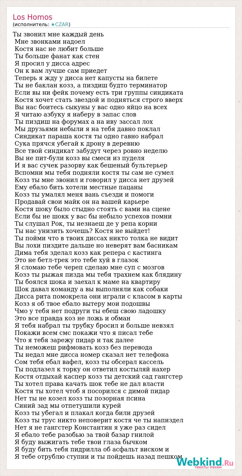 Ты звонил мне каждый день Мне звонками надоел Костя нас не любит больше Ты больше фанат как стен Я просил у дисса адрес Он к вам лучше сам приедет Теперь я жду у дисса нет капусты на билете Ты не баклан козз, а пиздиш будто терминатор Если вы ни фейк почему есть три группы синдиката Костя хочет стать звездой и подняться строго вверх Вы нас боитесь сыкуны у вас одно яйцо на всех Я читаю азбуку я наберу в запас слов Ты пиздиш на форумах а на иву зассал лох Мы друзьями небыли я на тебя давно поклал Синдикат параша костя ты одно гавно набрал Сука прячся убегай к дрону в деревню Все твой синдикат забудут через ровно неделю Вы не пит-були козз вы смеси из пуделя И я вас сучек разорву как бешеный бультерьер Вспомни мы тебя подняли костя ты сам не сумел Козз ты мне звонил и говорил у дисса нет друзей Ему ебало бить хотели местные пацаны Козз ты умалял меня вань съезди и помоги Продавай свои майк он на вашей карьере Костя шоку было стыдно стоять с вами на сцене Если бы не шокк у вас бы небыло успехов помни Ты слушал Рок, ты незнаеш де у репа корни Ты нас унизить хочешь? Костя не выйдет! Ты пойми что в твоих диссах никто толка не видит Вы лохи пиздите дальше но неверят вам басникам Дима тебя зделал козз как репера с кастинга Это не бетл-трек это тебе хуй в глазок Я сломаю тебе череп сделаю мне суп с мозгов Козз ты рыжая пизда мы тебя трахнем как блядину Ты боялся шока и заехал к маме на квартиру Шок давал команду а вы выполняли как собаки Дисса рита помокрела они играли с класом в карты Козз я об твое ебало вытеру мои подошвы Чмо у тебя нет подруги ты ебеш свою ладошку Это все правда коз не ложь и обман Я тебя набрал ты трубку бросил и больше невзял Покажи всем смс покажи что я писал тебе Что я тебя зарежу пидар и так далее Ты неможеш рифмовать козз без перевода Ты недал мне дисса номер сказал нет телефона Сом тебя ебал вафел, козз ты обсерал кассель Ты подлазел к торку он ответил костыляй нахер Костя отдыхай каспер козз ты детский сад гангстер Ты хотел права качать шок тебе не дал власти Костя ты хотел чтоб я посорился с димой пидар Нет ты не козел козз ты позорная псина Синий зад мы отпетушили курей Козз ты убегал и плакал когда били друзей Козз ты трус никто неповерит костя че ты напиздел Нет я не гангстер Константин я уже раз сидел Я ебало тебе разобью за твой базар гнилой Я буду выжигать тебе твои глаза бычком Я буду бить тебя пидрилла об асфальт виском и Я тебе отрублю ступни и ты пойдешь назад пешком